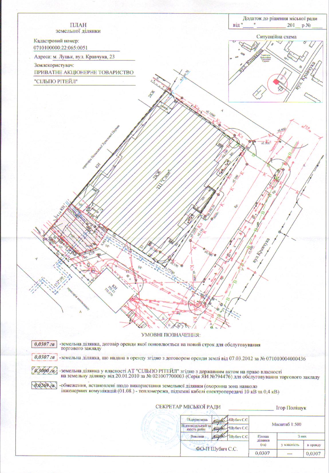 Розглянувши клопотання ПРИВАТНОГО АКЦІОНЕРНОГО ТОВАРИСТВА «СІЛЬПО РІТЕЙЛ» щодо поновлення договору оренди землі, зареєстрованого у Державному реєстрі земель від 07.03.2012 за № 071010004000436 (право оренди земельної ділянки зареєстроване в Державному реєстрі речових прав на нерухоме майно від 11.01.2017, номер запису про інше речове право: 18592209), витяг з Державного земельного кадастру про земельну ділянку від 22.03.2017 № НВ-0702865632017, враховуючи правовстановлюючі документи ПРИВАТНОГО АКЦІОНЕРНОГО ТОВАРИСТВА «СІЛЬПО РІТЕЙЛ» на об'єкт нерухомого майна на вул. Кравчука, 23: рішення Гоподарського суду Волинської області від 16.11.2007 № 04/63-75, відповідно до якого право власності на приміщення торгового центру по продажу промислових та продовольчих товарів зареєстровано 08.10.2008 із внесеними змінами 19.08.2011, реєстраційний номер: 6649986 (право власності на об’єкт нерухомого майна зареєстроване в Державному реєстрі речових прав на нерухоме майно від 04.06.2013, номер запису про право власності: 1291866), технічний паспорт на об'єкт нерухомого майна від 14.08.2007 із змінами внесеними 19.08.2011, державний акт на право власності на земельну ділянку площею 0,3000 га, зареєстрований в Книзі записів реєстрації державних актів на право власності на землю та на право постійного користування землею, договорів оренди землі від 20.01.2010 за № 021007700003 (право власності на земельну ділянку зареєстровано в Державному реєстрі речових прав на нерухоме 10.04.2013, номер запису про право власності: 802798), керуючись статтями 12, 93, 96 Земельного кодексу України, статтею 33 Закону України «Про оренду землі», Законом України «Про Державний земельний кадастр», Законом України «Про державну реєстрацію речових прав на нерухоме майно та їх обтяжень», Законом України «Про внесення змін до деяких законодавчих актів України щодо розмежування земель державної та комунальної власності», статтею 26 Закону України «Про місцеве самоврядування в Україні», пунктами 162, 171 Постанови Кабінету Міністрів України від 17.10.2012 № 1051 «Про затвердження Порядку ведення Державного земельного кадастру», витягом з протоколу № 58 засідання постійної комісії з питань земельних відносин та земельного кадастру від 19.09.2013, пунктами 8, 30 договору оренди землі, міська рада