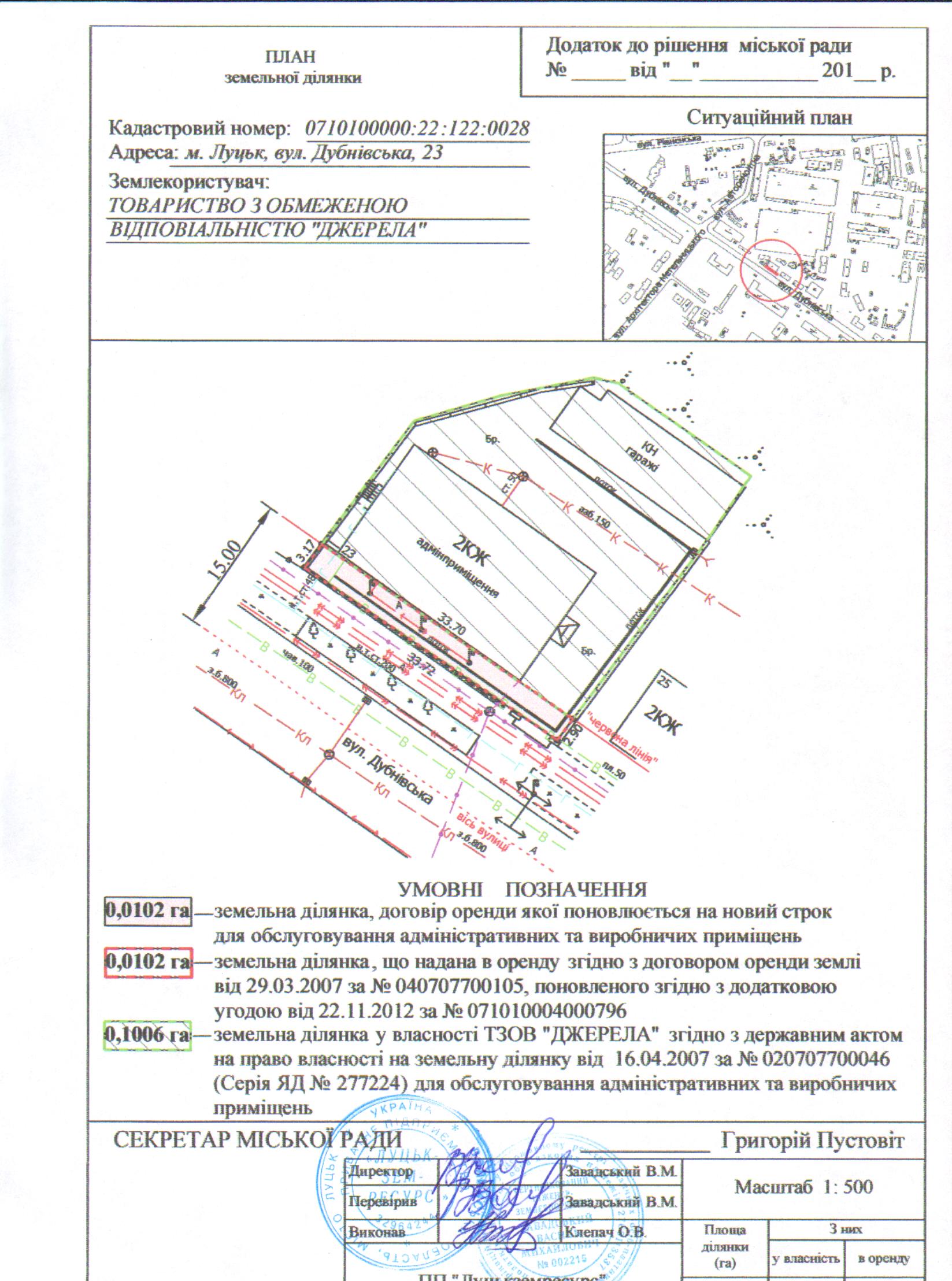Розглянувши клопотання ТОВАРИСТВА З ОБМЕЖЕНОЮ ВІДПОВІДАЛЬНІСТЮ «ДЖЕРЕЛА» щодо поновлення договору оренди землі, зареєстрованого в книзі записів державної реєстрації договорів оренди землі від 29.03.2007 за № 040707700105, поновленого додатковою угодою про поновлення договору оренди землі, зареєстрованою у Державному реєстрі земель від 22.11.2012 за № 071010004000796, витяг з Державного земельного кадастру про земельну ділянку від 16.11.2017 № НВ-0703545032017, враховуючи правовстановлюючі документи ТОВАРИСТВА З ОБМЕЖЕНОЮ ВІДПОВІДАЛЬНІСТЮ «ДЖЕРЕЛА» на об'єкти нерухомого майна на вул. Дубнівській, 23: свідоцтво про право власності від 12.02.2008, відповідно до якого право власності на адмінприміщення зареєстровано 16.04.2008, реєстраційний номер: 10774894, технічний паспорт від 15.10.2007; свідоцтво про право власності від 12.02.2008, відповідно до якого право власності на виробничі приміщення зареєстровано 16.04.2008, реєстраційний номер: 10775111, технічний паспорт від 15.10.2007; державний акт на право власності на земельну ділянку площею 0,1006 га, зареєстрований в Книзі записів реєстрації державних актів на право власності на землю та на право постійного користування землею, договорів оренди землі від 16.04.2007 за № 020707700046, керуючись статтями 12, 93, 96 Земельного кодексу України, статтею 33 Закону України «Про оренду землі», статтею 4 Закону України «Про державну реєстрацію речових прав на нерухоме майно та їх обтяжень», Законом України «Про внесення змін до деяких законодавчих актів України щодо розмежування земель державної та комунальної власності», статтею 26 Закону України «Про місцеве самоврядування в Україні», пунктами 162, 171 Постанови Кабінету Міністрів України від 17.10.2012 № 1051 «Про затвердження Порядку ведення Державного земельного кадастру», пунктами 8, 30 договору оренди землі, міська рада