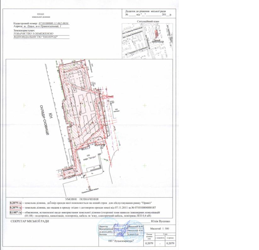 1. Продовжити ТОВАРИСТВУ З ОБМЕЖЕНОЮ ВІДПОВІДАЛЬНІСТЮ «ЕКОПРОД» термін оренди земельної ділянки на м-ні Привокзальному, 1 строком на 1 рік з дати закінчення договору оренди землі (до 07.11.2017), площею 0,2079 га, кадастровим номером 0710100000:11:062:0036, для обслуговування ринку «Привіз», згідно з додатком.