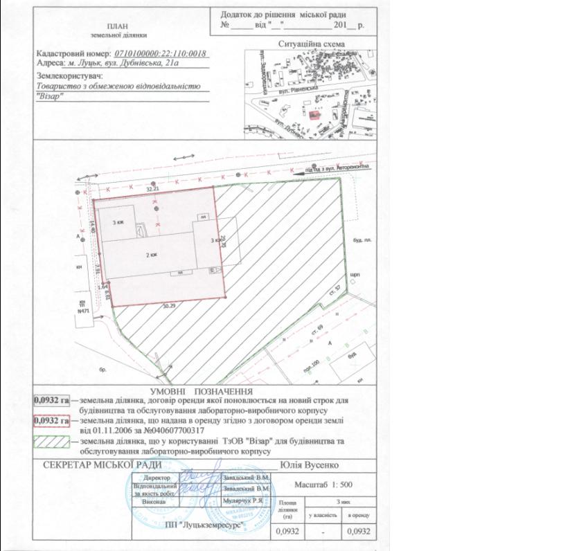 1. Продовжити товариству з обмеженою відповідальністю «Візар» термін оренди земельної ділянки на вул. Дубнівській, 21а строком на 10 років з дати закінчення договору оренди землі (до 01.11.2026), площею 0,0932 га, кадастровим номером 0710100000:22:110:0018, для будівництва та обслуговування лабораторно-виробничого корпусу, згідно з додатком.