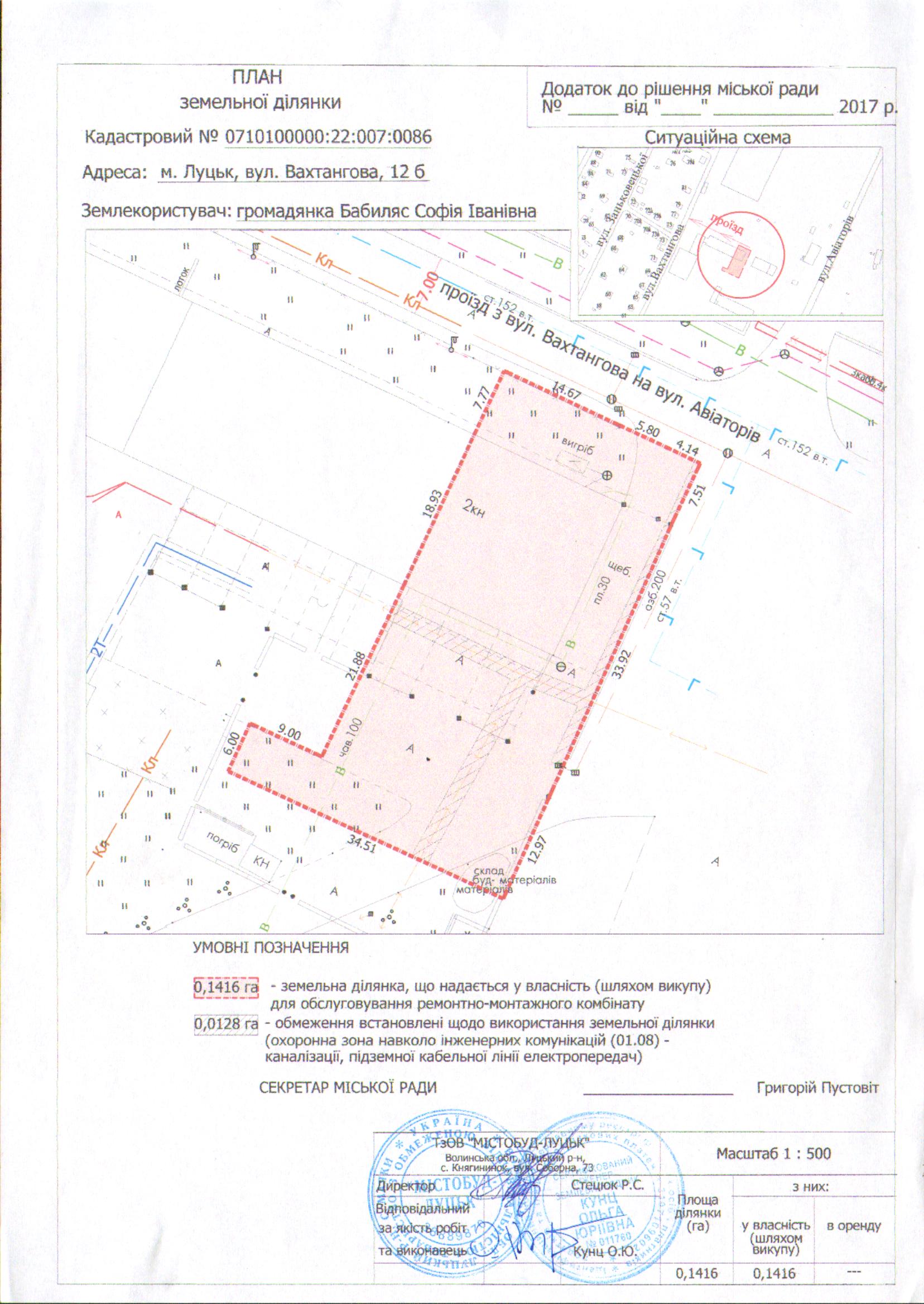Розглянувши заяву громадянки Бабиляс Софії Іванівни про продаж у власність земельної ділянки несільськогосподарського призначення комунальної власності на вул. Вахтангова, 12б площею 0,1416 га для обслуговування ремонтно-монтажного комбінату, звіт про її експертну грошову оцінку, керуючись ст.ст. 12, 81, 120, 127, 128 Земельного кодексу України, ст.ст. 4, 5, 12 Закону України «Про державну реєстрацію речових прав на нерухоме майно та їх обтяжень», ст. 26 Закону України «Про місцеве самоврядування в Україні», витягом з Державного земельного кадастру про земельну ділянку від 15.03.2017 № НВ-0702844522017, міська рада