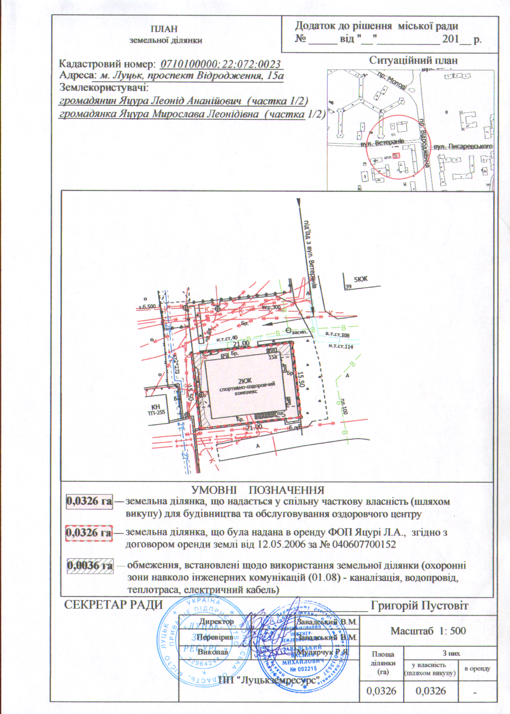 1. Зареєструвати за територіальною громадою міста Луцька в особі Луцької міської ради право комунальної власності на земельну ділянку несільськогосподарського призначення комунальної власності на проспекті Відродження, 15а у місті Луцьку, площею 0,0326 га, кадастровим номером 0710100000:22:072:0023, для будівництва та обслуговування оздоровчого центру.