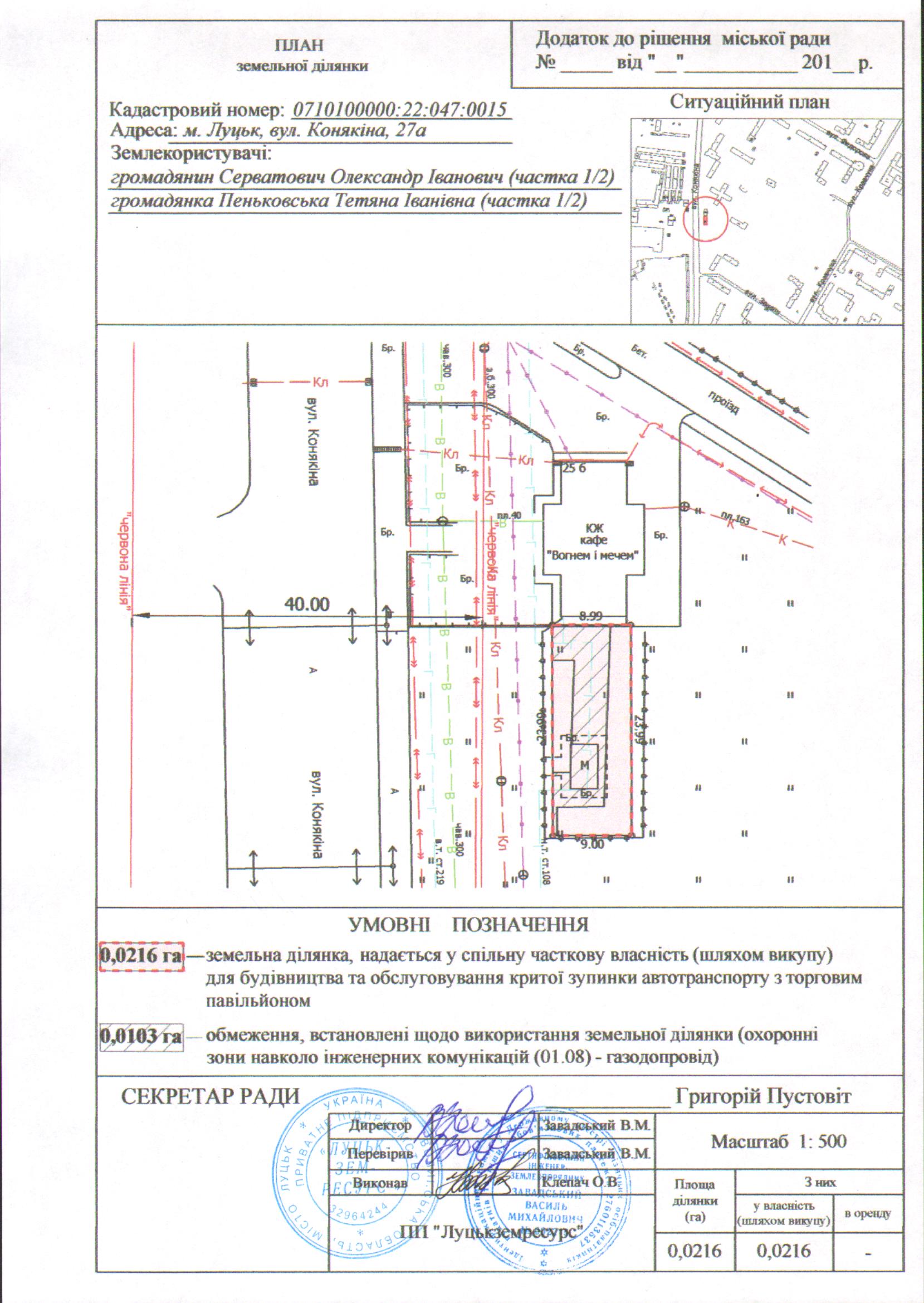 Розглянувши заяву громадян Серватовича Олександра Івановича, Пеньковської Тетяни Іванівни про продаж у спільну часткову власність земельної ділянки несільськогосподарського призначення комунальної власності на вул. Конякіна, 27а площею 0,0216 га для будівництва та обслуговування критої зупинки автотранспорту з торговим павільйоном, звіт про її експертну грошову оцінку, керуючись статтями 12, 81, 88, 120, 127, 128 Земельного кодексу України, статтями 4, 5, 12 Закону України «Про державну реєстрацію речових прав на нерухоме майно та їх обтяжень», ст. 26 Закону України «Про місцеве самоврядування в Україні», витягом з Державного реєстру речових прав на нерухоме майно від 17.04.2015, № 36406311, витягом з Державного земельного кадастру про земельну ділянку від 20.11.2017 № НВ-0001010712017, міська рада