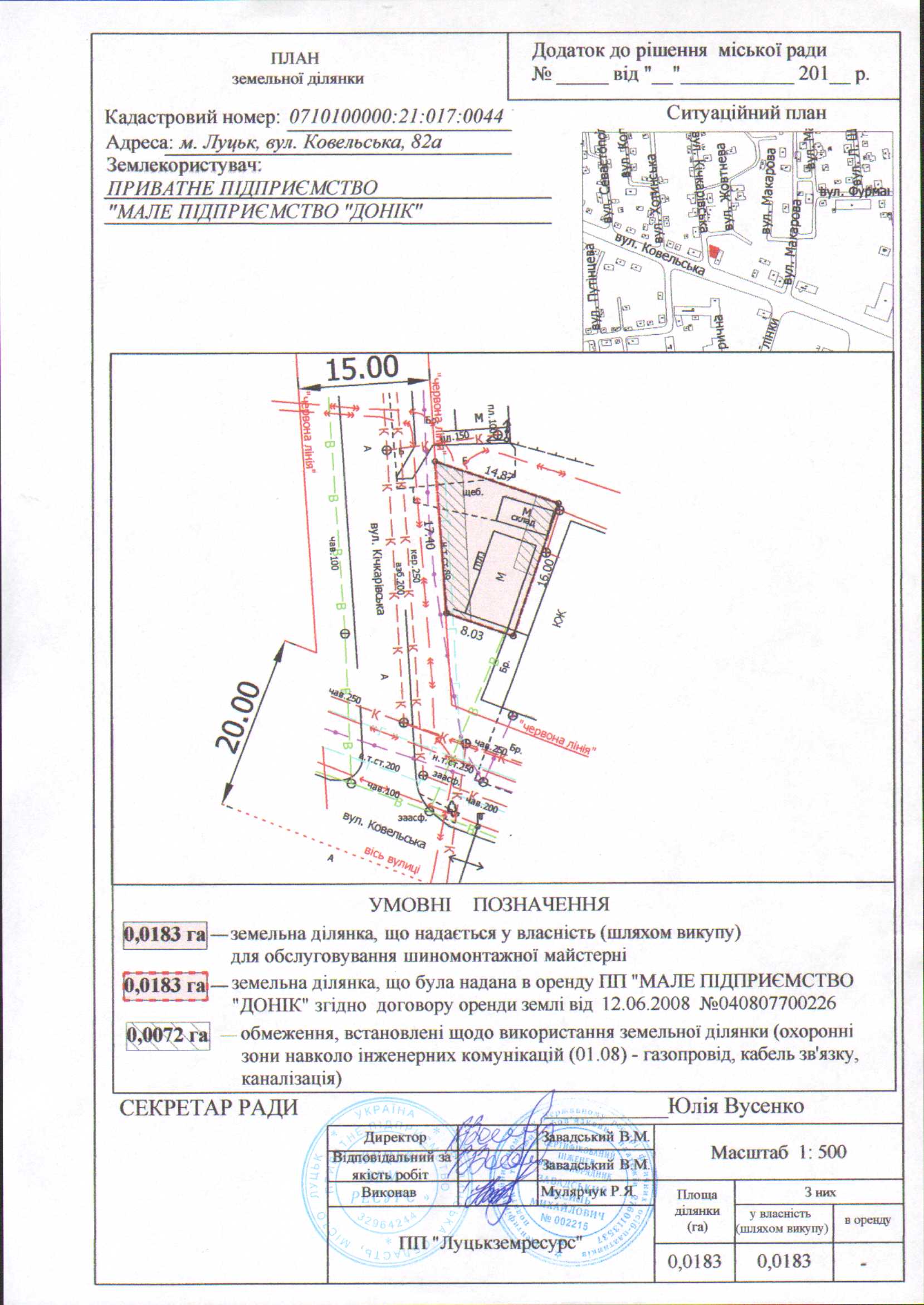 1. Продати у власність ПРИВАТНОМУ ПІДПРИЄМСТВУ “МАЛЕ ПІДПРИЄМСТВО “ДОНІК” земельну ділянку на вул. Ковельській, 82а, площею 0,0183 га, кадастровим номером 0710100000:21:017:0044, для обслуговування шиномонтажної майстерні, на затверджених у п.п. 2,3 цього рішення умовах, згідно з додатком.