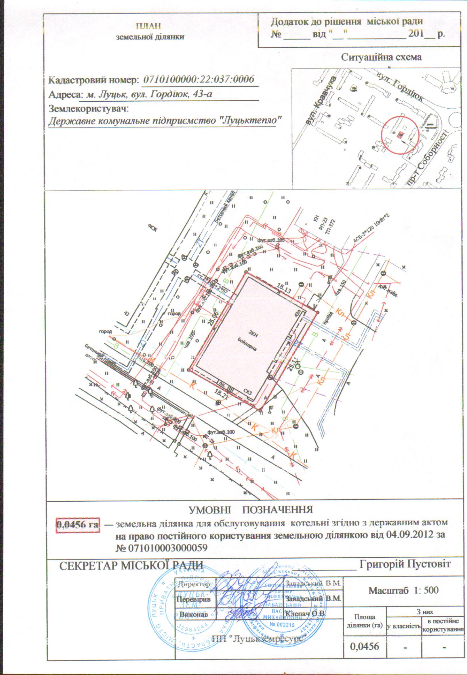 2. Державному комунальному підприємству «Луцьктепло» у зв’язку з припиненням права постійного користування земельною ділянкою на вул. Гордіюк, 43-а, повернути Луцькій міській раді оригінал державного акта на право постійного користування земельною ділянкою серії ЯЯ №035905, зареєстрованого в Книзі записів реєстрації державних актів на право постійного користування землею від 04.09.2012 за №071010003000059.
