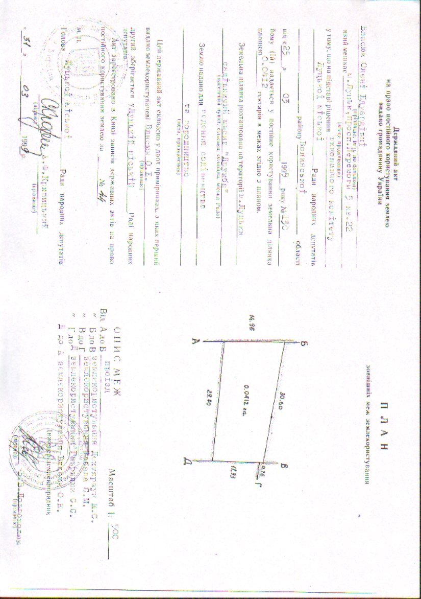1. Припинити громадянці Власюк Олені Едуардівні право постійного користування земельною ділянкою на вул. Володимирській в садівничому товаристві «Дружба» № 412, площею 0,0412 га для ведення садівництва та городництва, у зв’язку з добровільною відмовою від права постійного користування земельною ділянкою та передачею безоплатно у власність вищезазначеної земельної ділянки. Копія державного акта на право постійного користування землею серії ВЛ №44-П, зареєстрованого в Книзі записів державних актів на право постійного користування землею за №44 від 31.03.1999, додається.