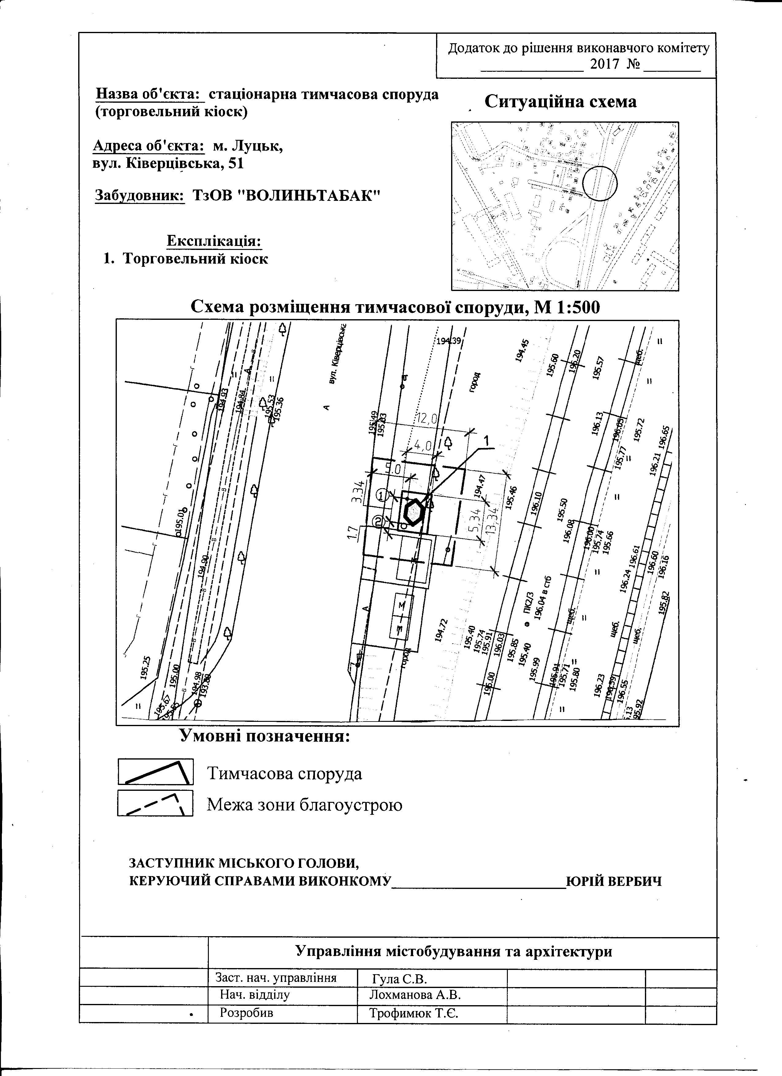 1. Погодити товариству з обмеженою відповідальністю «ВОЛИНЬТАБАК» розміщення стаціонарної тимчасової споруди для провадження підприємницької діяльності (торговельного кіоску) на вул. Ківерцівській, 51 (згідно з додатком) на термін 3 роки, за умови укладення договорів на прибирання території та вивіз побутових відходів.