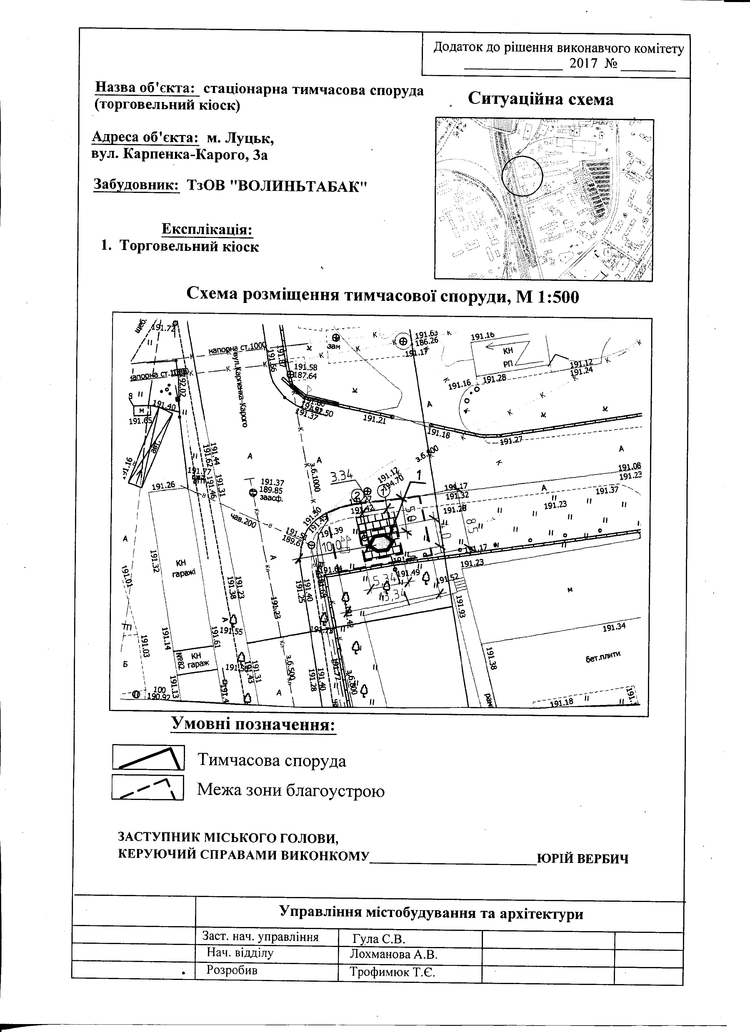 1. Погодити товариству з обмеженою відповідальністю «ВОЛИНЬТАБАК» розміщення стаціонарної тимчасової споруди для провадження підприємницької діяльності (торговельного кіоску) на вул. Карпенка-Карого, 3а (згідно з додатком) на термін 3 роки, за умови укладення договорів на прибирання території та вивіз побутових відходів.
