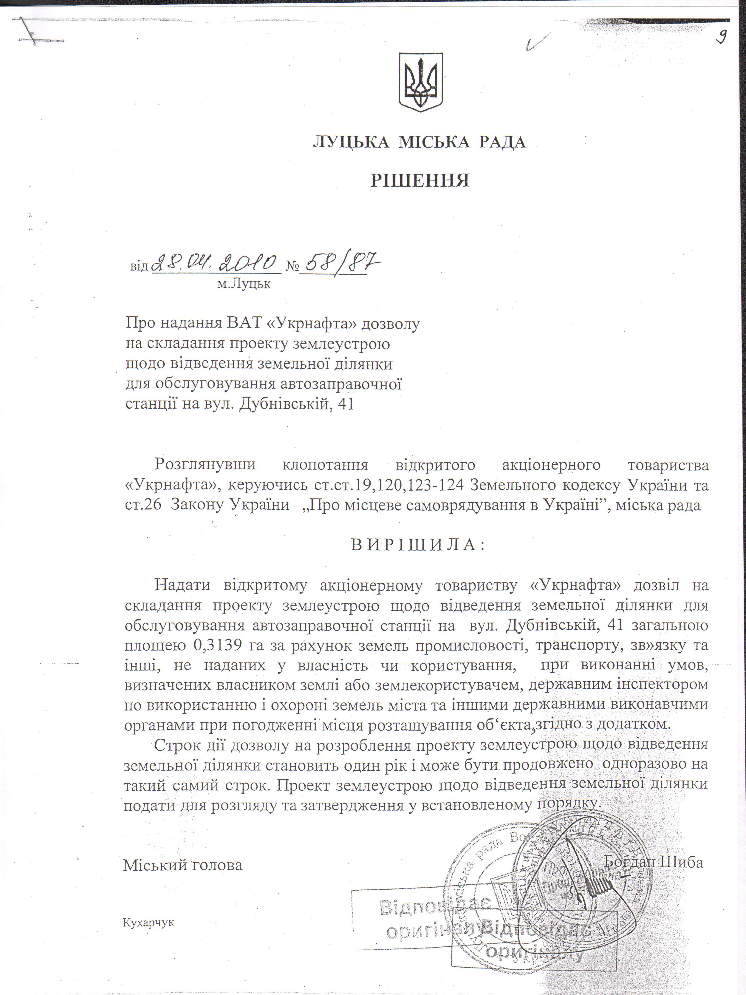 1. Скасувати рішення Луцької міської ради від 28.04.2010 № 58/87 «Про надання ВАТ «Укрнафта» дозволу на складання проекту землеустрою щодо відведення земельної ділянки для обслуговування автозаправочної станції на вул. Дубнівській, 41».