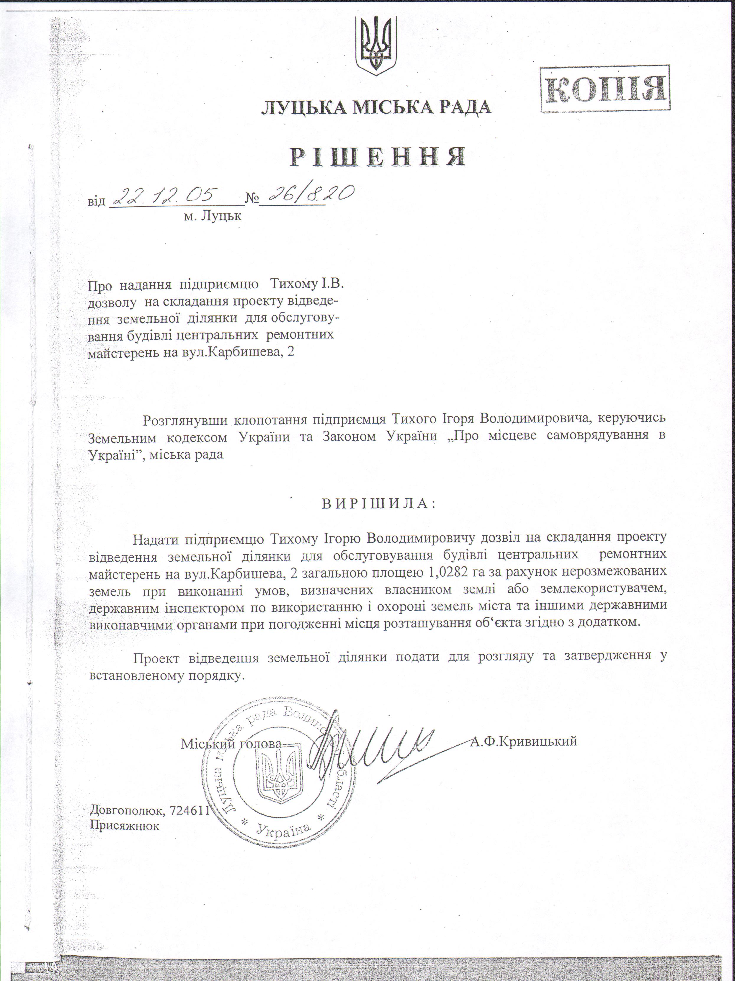 1. Скасувати рішення Луцької міської ради від 22.12.2005 № 26/8.20 «Про надання підприємцю Тихому І.В. дозволу на складання проекту відведення земельної ділянки для обслуговування будівлі центральних ремонтних майстерень на вул. Карбишева, 2».