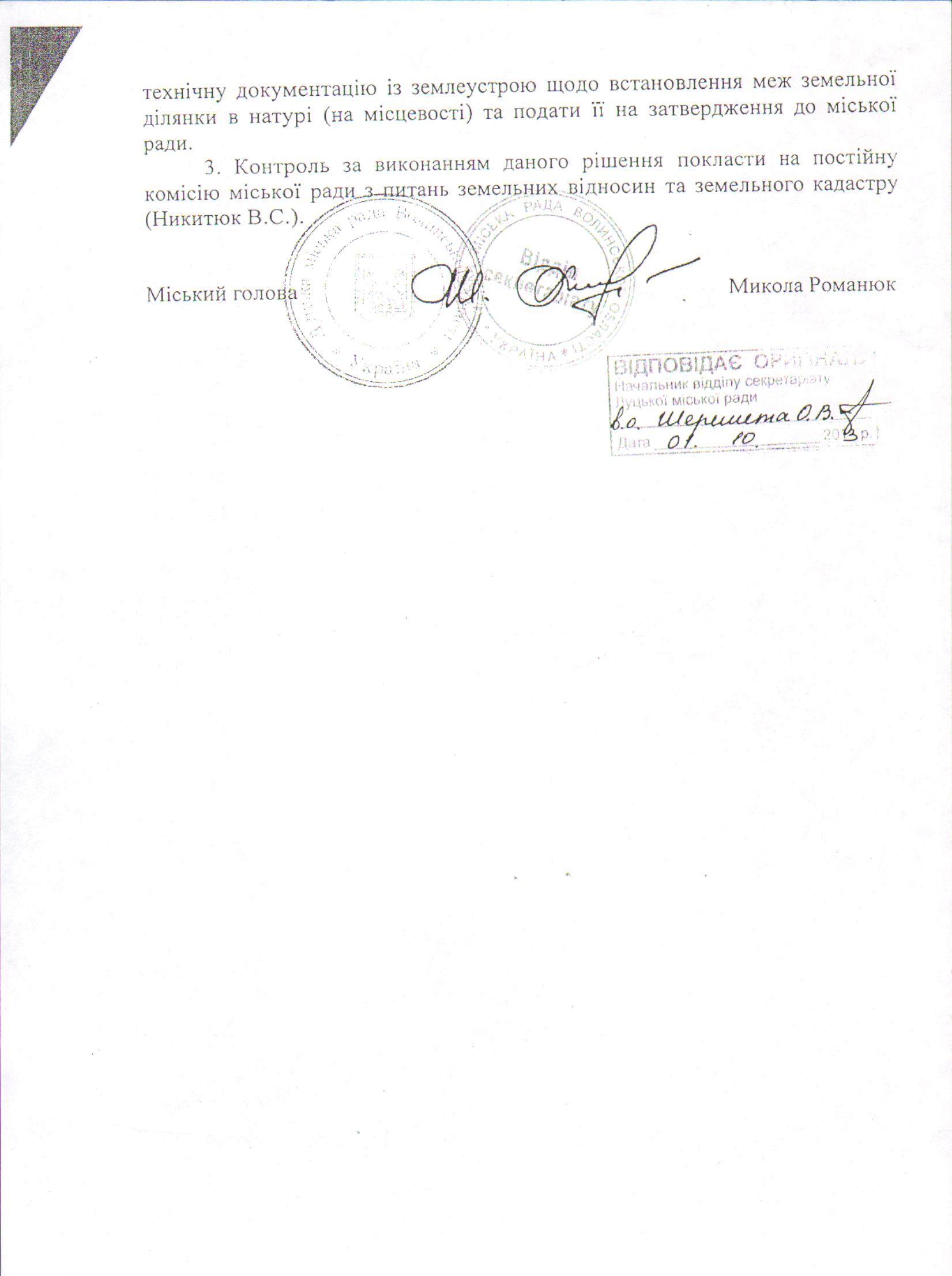 2. Контроль за виконанням даного рішення покласти на постійну комісію міської ради з питань земельних відносин та земельного кадастру (Ткачук Є.Є.).