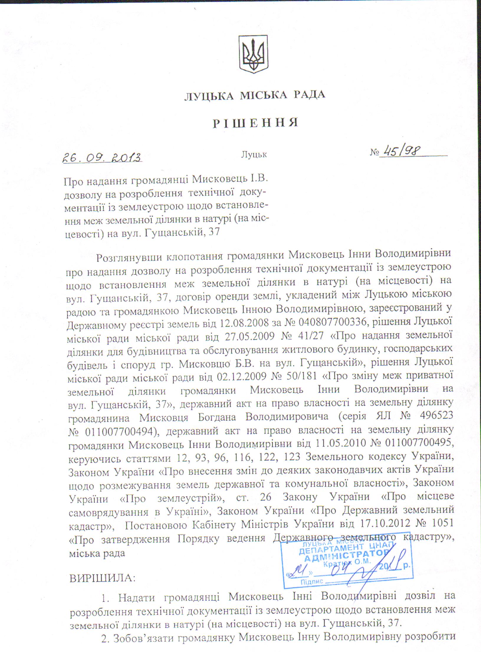 1. Скасувати рішення Луцької міської ради від 26.09.2013 № 45/98 “Про надання громадянці Мисковець І.В. дозволу на розроблення технічної документації із землеустрою щодо встановлення меж земельної ділянки в натурі (на місцевості) на вул. Гущанській, 37”.