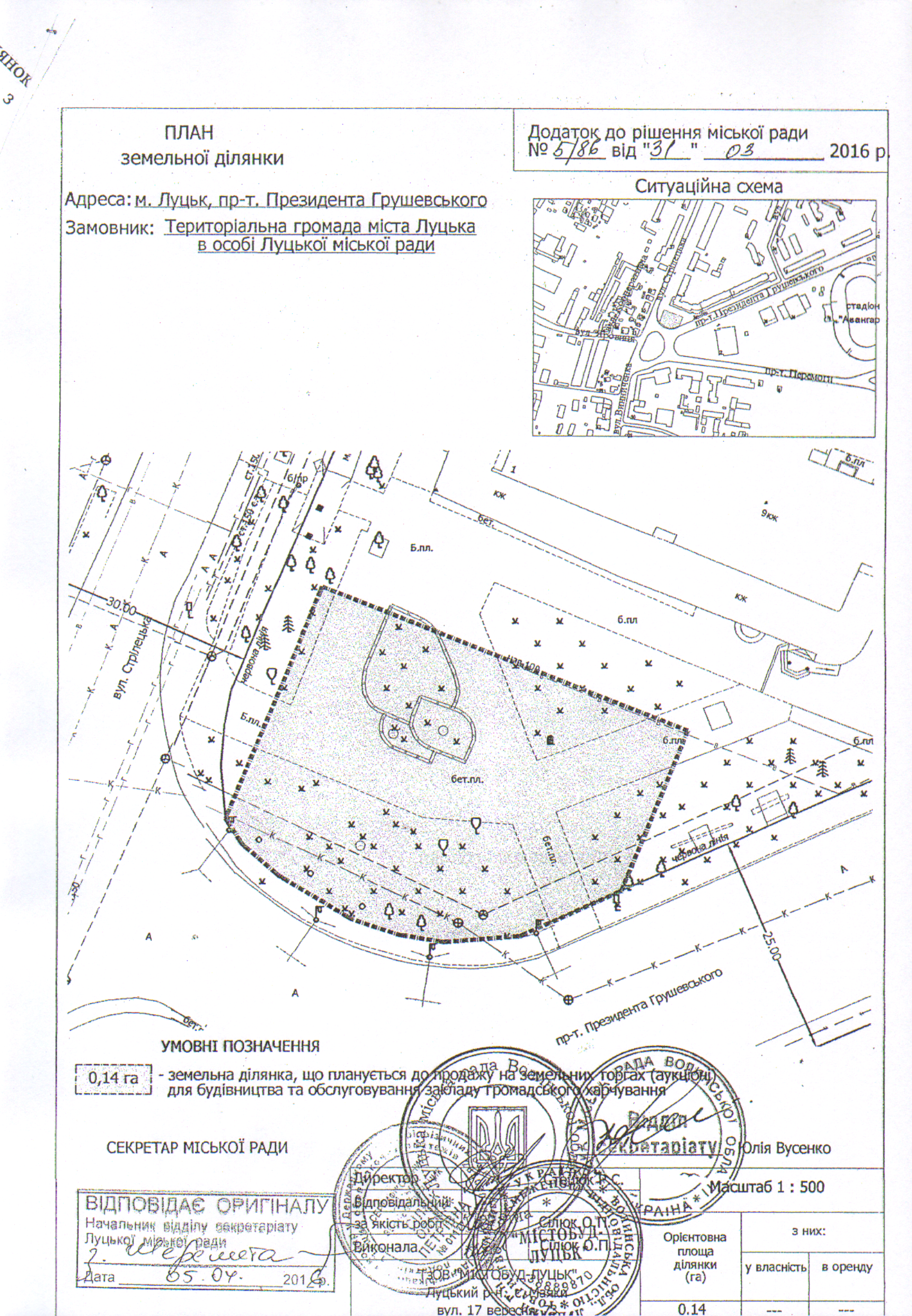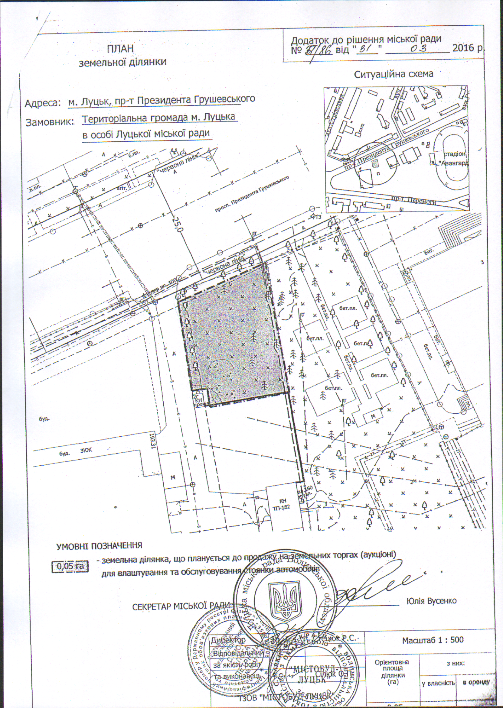 Розглянувши колективне звернення ветеранів-авіаторів та жителів міста Луцька щодо збереження території на розі вул. Стрілецької та проспекту Президента Грушевського, на якій встановлено меморіальний камінь видатному льотчику Першої світової війни Костянтину Арцеулову, який загинув у Волинському небі в 1916 році, а також враховуючи прийняття виконавчим комітетом Луцької міської ради рішень від 06.07.2016 № 385-1 “Про надання погодження на укладення договору про співпрацю у сфері розвитку інженерно-транспортної інфраструктури” та від 21.06.2017 № 328-1 “Про внесення змін в рішення виконавчого комітету від 06.07.2016 № 385-1”, керуючись статтями 13, 142, 144 Конституції України, статтями 12, 136 Земельного кодексу України, статтями 25, 26, 59 Закону України “Про місцеве самоврядування в Україні”, міська рада