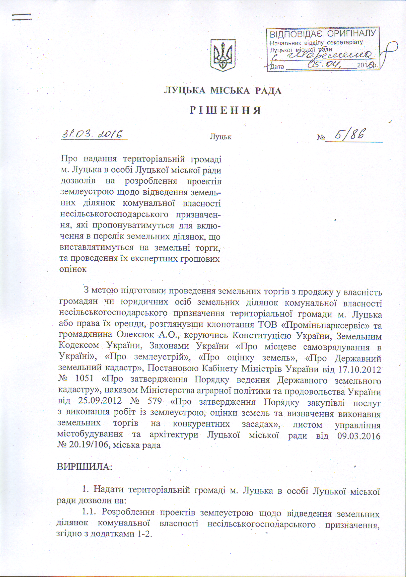 1. Скасувати рішення Луцької міської ради від 31.03.2016 № 5/86 “Про надання територіальній громаді м. Луцька в особі Луцької міської ради дозволів на розроблення проектів землеустрою щодо відведення земельних ділянок комунальної власності несільськогосподарського призначення, які пропонувати-муться для включення в перелік земельних ділянок, що виставлятимуться на земельні торги, та проведення їх експертних грошових оцінок”.