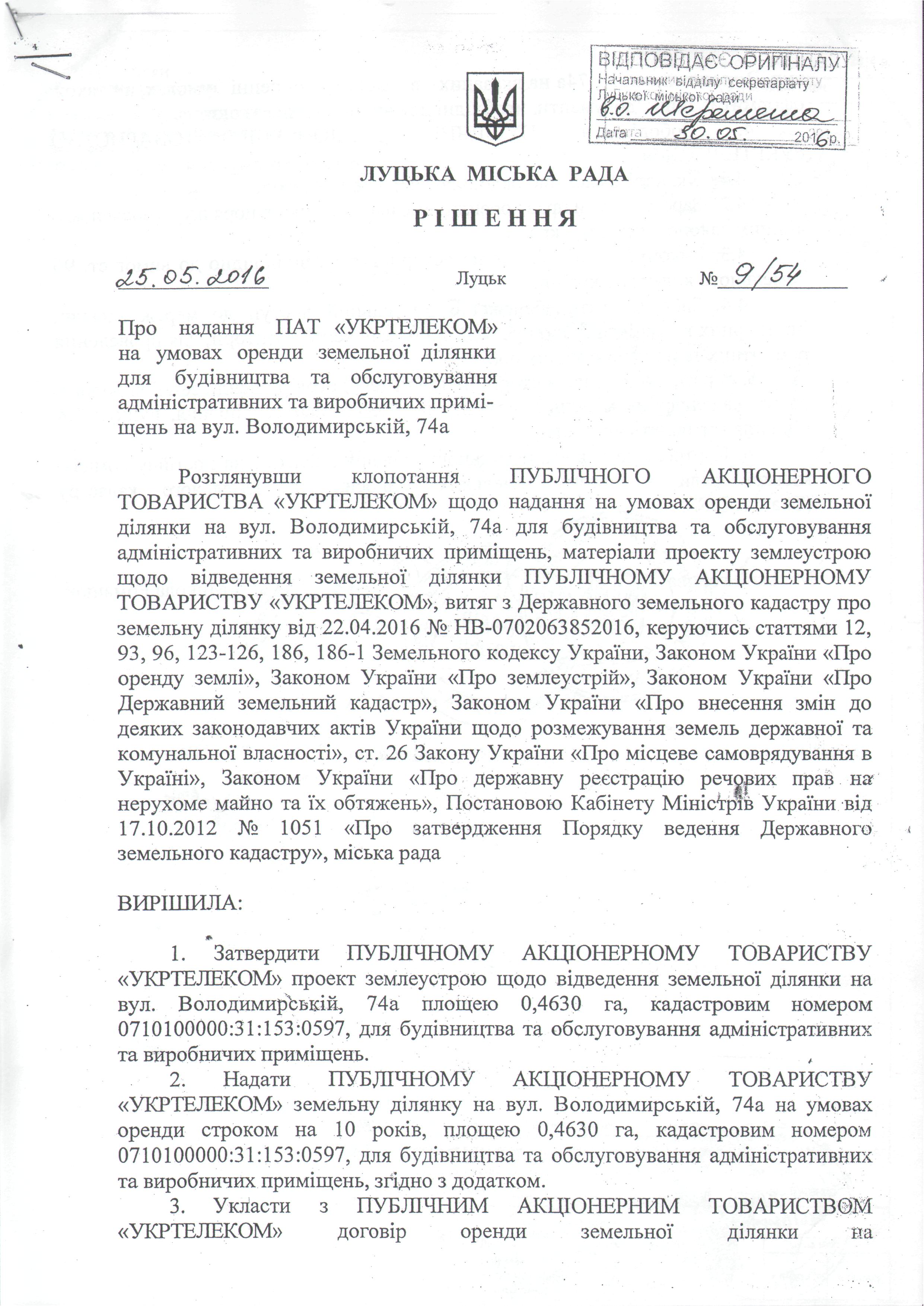 1. Скасувати пункти 2-5 рішення Луцької міської ради від 25.05.2016 № 9/54 «Про надання ПАТ «УКРТЕЛЕКОМ» на умовах земельної ділянки для будівництва та обслуговування адміністративних та виробничих приміщень на вул. Володимирській, 74а».