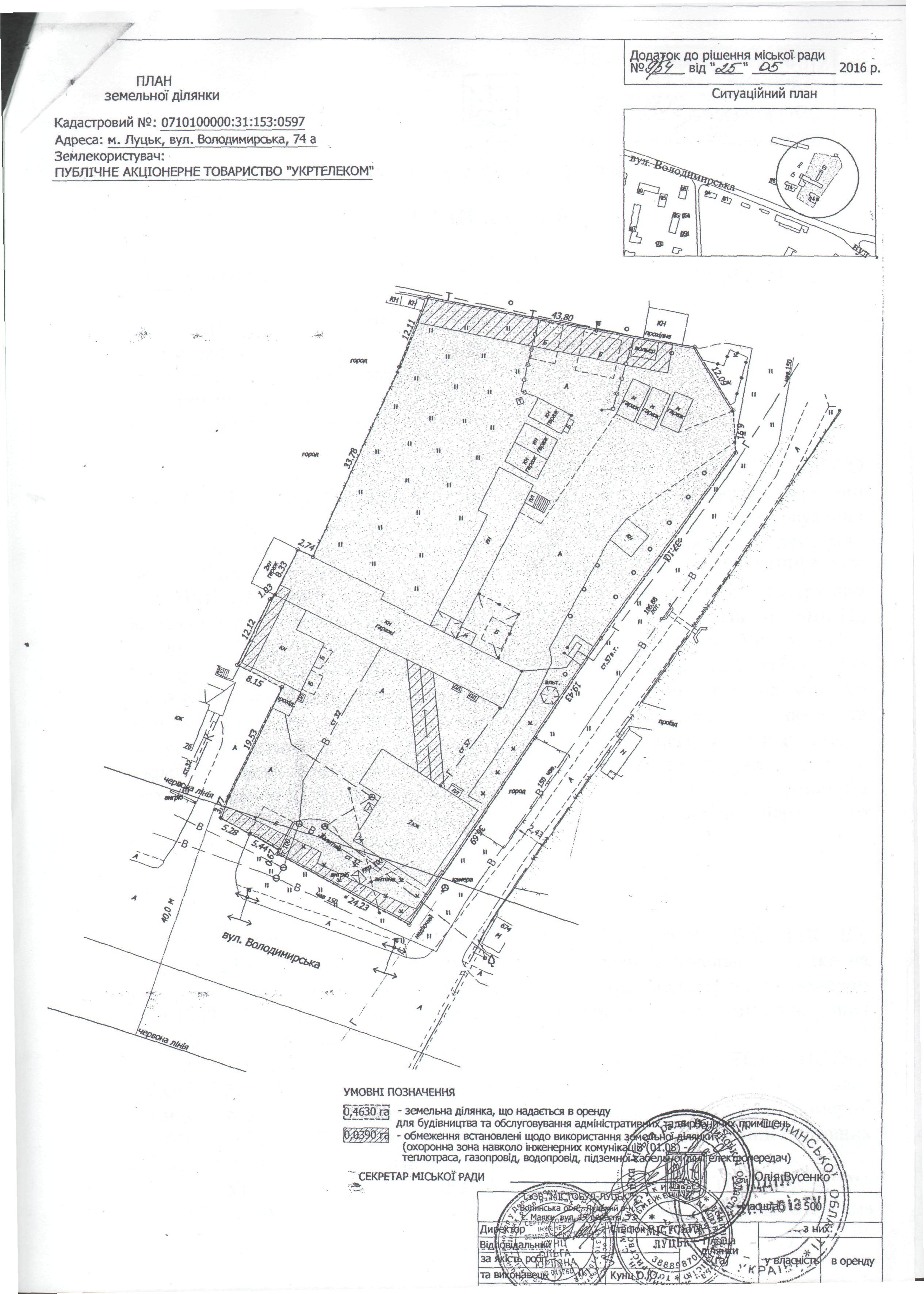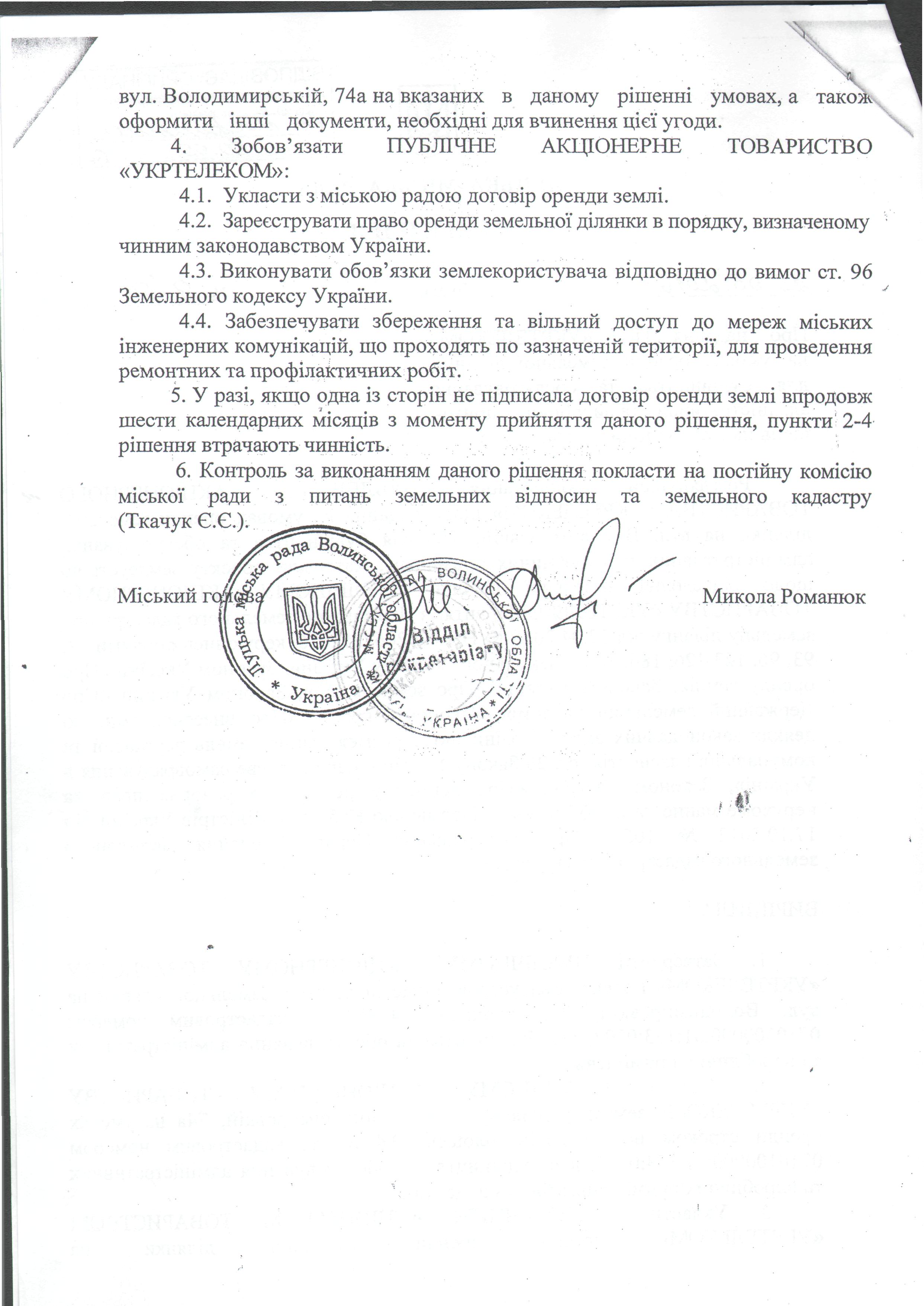 2. Зобов’язати ПУБЛІЧНЕ АКЦІОНЕРНЕ ТОВАРИСТВО «УКРТЕЛЕКОМ» спільно із товариством з обмеженою відповідальністю «Волинькомплект» оформити право оренди на земельну ділянку за адресою: м. Луцьк, вул. Володимирська, 74а, площею 0,4630 га.