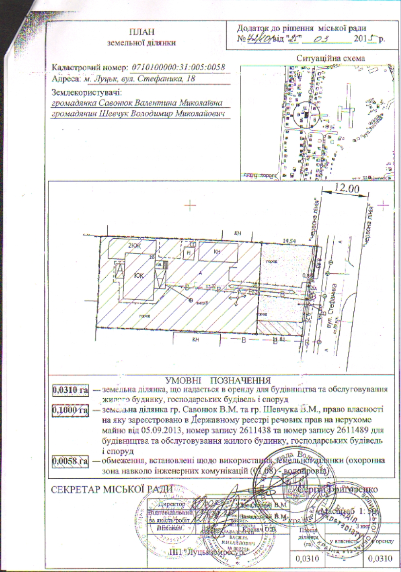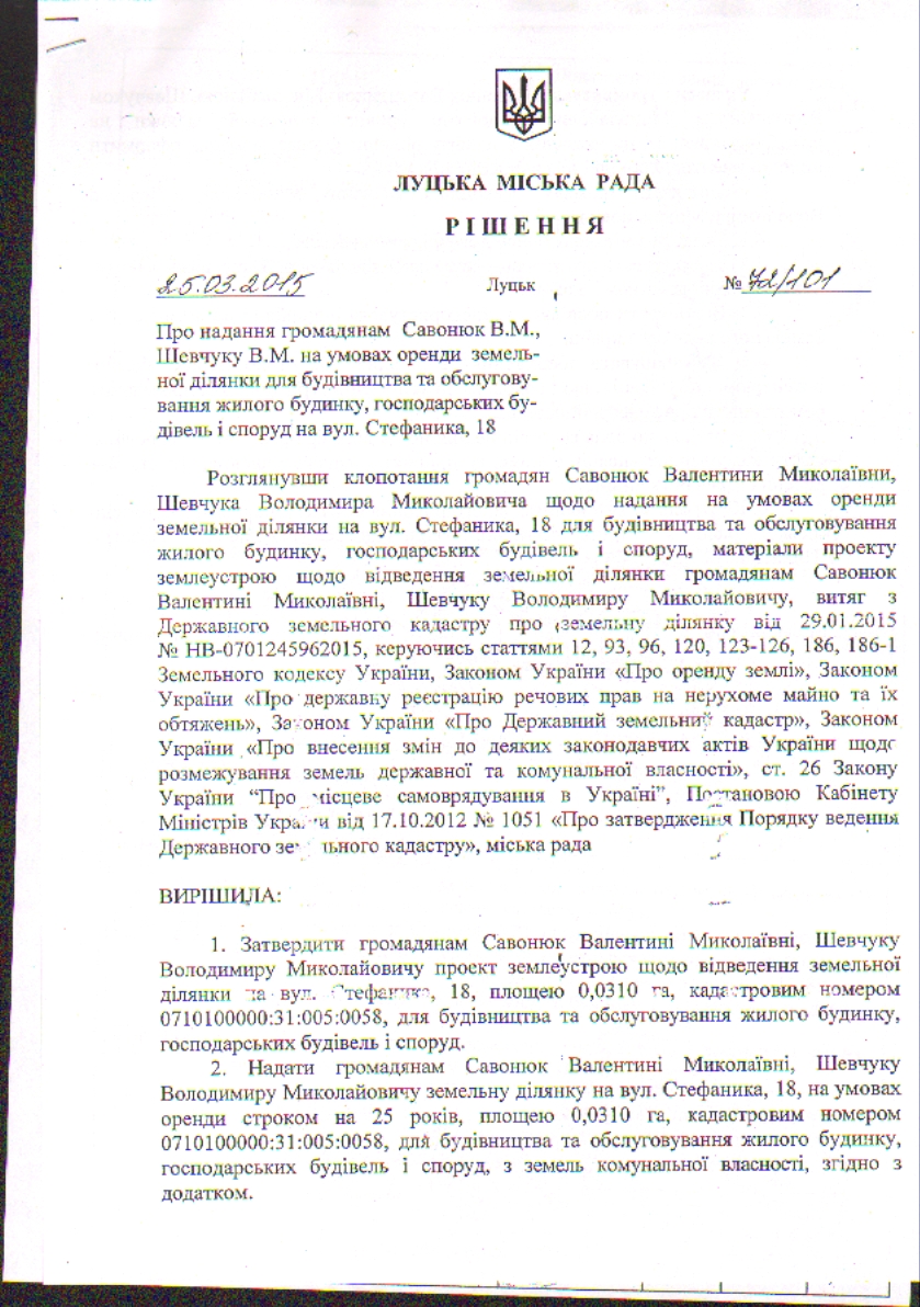 2. Скасувати рішення Луцької міської ради від 25.03.2015 № 72/101 «Про надання громадянам Савонюк В.М., Шевчуку В.М. на умовах оренди земельної ділянки для будівництва та обслуговування жилого будинку, господарських будівель і споруд на вул. Стефаника, 18».