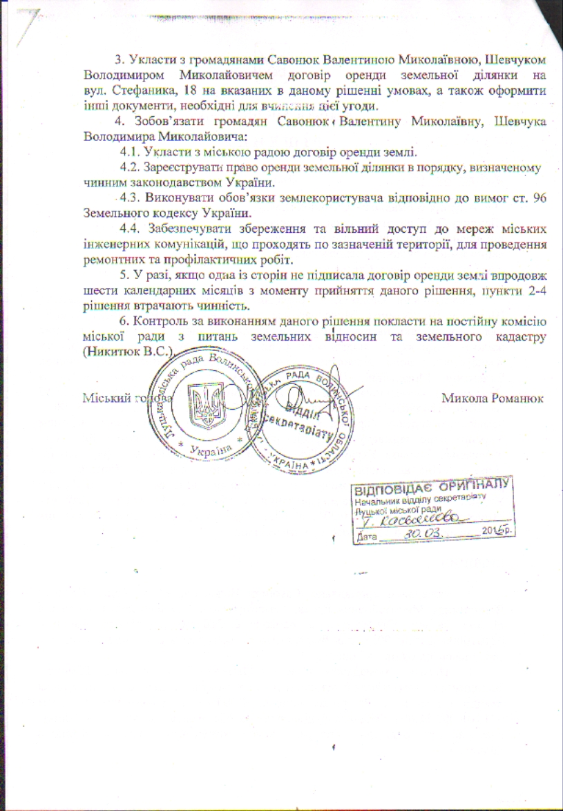 3. Договір оренди землі, укладений між Луцькою міською радою та громадянами Савонюк Валентиною Миколаївною, Шевчуком Володимиром Миколайовичем 14.09.2015 на підставі рішення Луцької міської ради від 25.03.2015 № 72/101, вважати неукладеним.