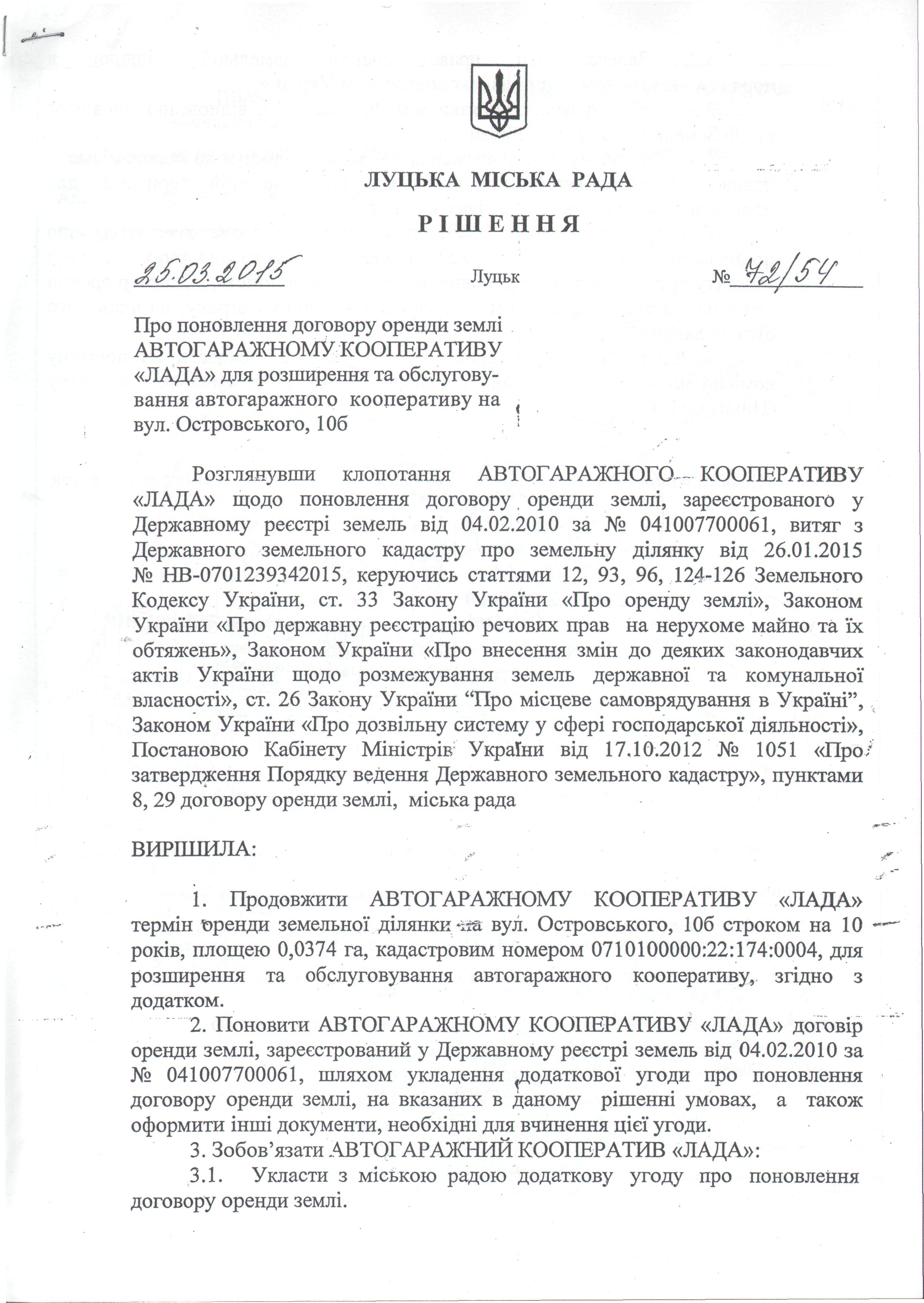 1. Скасувати рішення Луцької міської ради від 25.03.2015 № 72/54 «Про поновлення договору оренди землі АВТОГАРАЖНОМУ КООПЕРАТИВУ «ЛАДА» для розширення та обслуговування автогаражного кооперативу на вул. Островського, 10б».