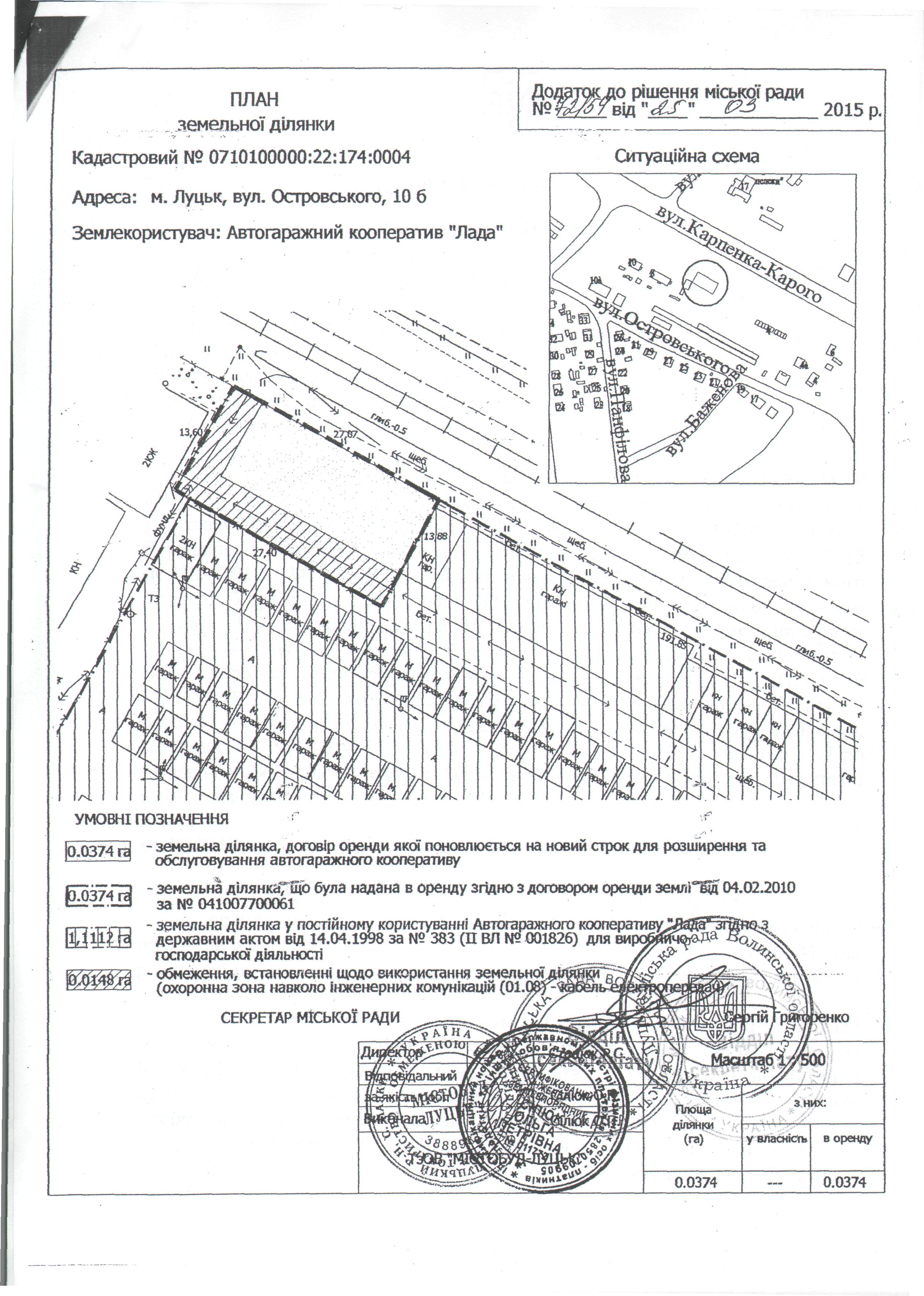 2. Додаткову угоду про поновлення договору оренди землі, зареєстрованого у Державному реєстрі земель від 04.02.2010 за № 041007700061, укладену 07.09.2015 на підставі рішення Луцької міської ради 25.03.2015№ 72/54 «Про поновлення договору оренди землі АВТОГАРАЖНОМУ КООПЕРАТИВУ «ЛАДА» для розширення та обслуговування автогаражного кооперативу на вул. Островського, 10б», вважати неукладеною, а договір оренди землі припиненим у зв’язку з закінченням строку, на який його було укладено.
