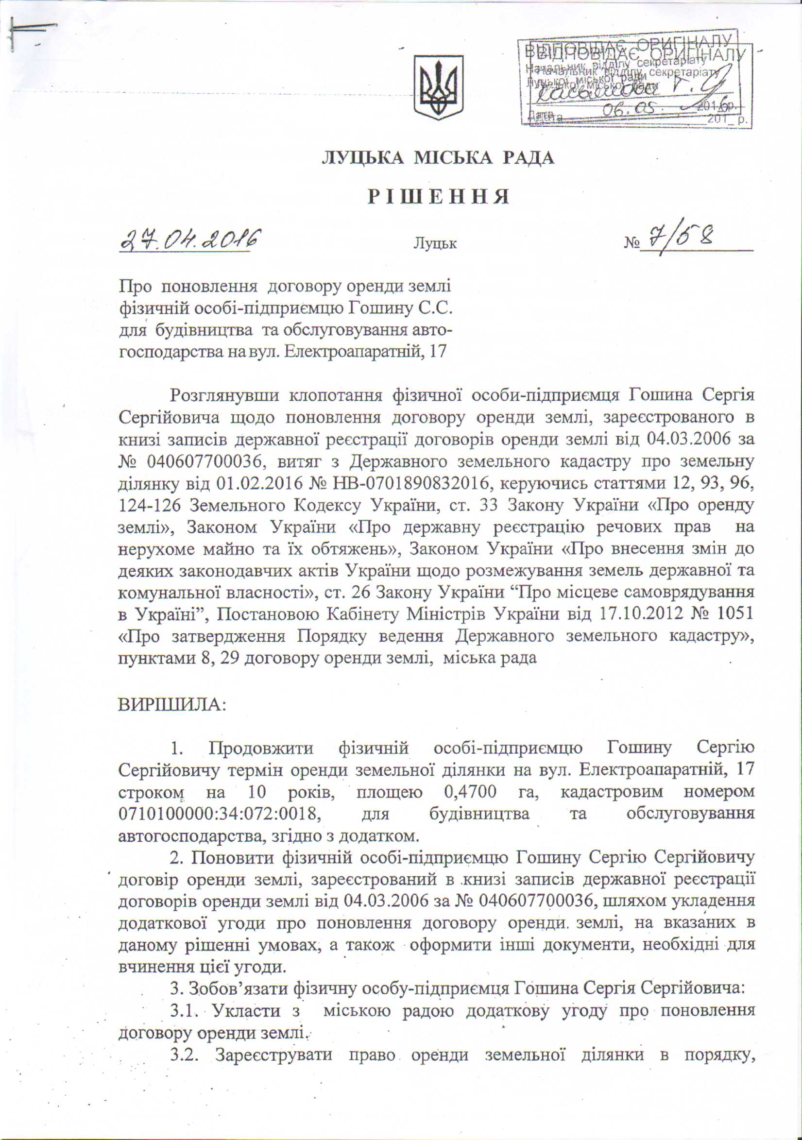 1. Скасувати рішення Луцької міської ради від 27.04.2016 № 7/58 «Про поновлення договору оренди землі фізичній особі-підприємцю Гошину С.С. для будівництва та обслуговування автогосподарства на вул. Електроапаратній, 17».