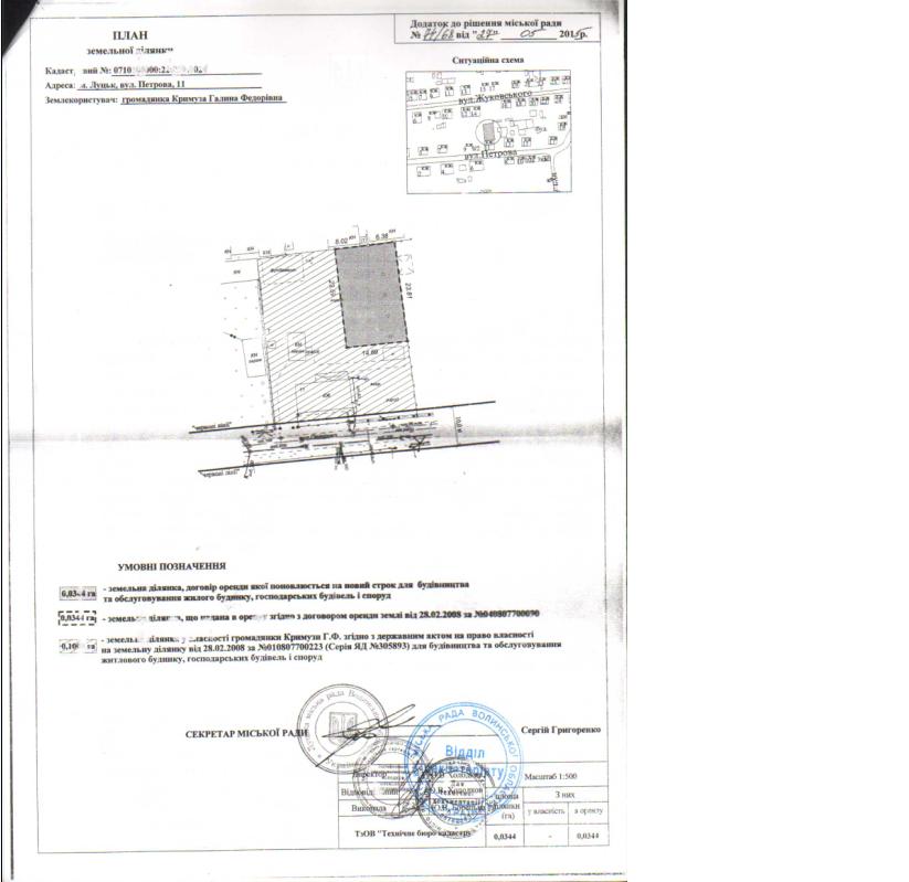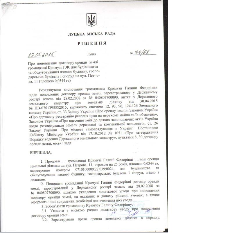 2. Додаткову угоду про поновлення договору оренди землі, зареєстрованого у Державному реєстрі земель від 28.02.2008 за № 040807700090, укладену 23.11.2015 на підставі рішення Луцької міської ради від 27.05.2015 № 74/68 «Про поновлення договору оренди землі громадянці Кримузі Г.Ф. для будівництва та обслуговування жилого будинку, господарських будівель і споруд на вул. Петрова, 11 (площею 0,0344 га)», вважати неукладеною, а договір оренди землі припиненим у зв’язку з закінченням строку, на який його було укладено.