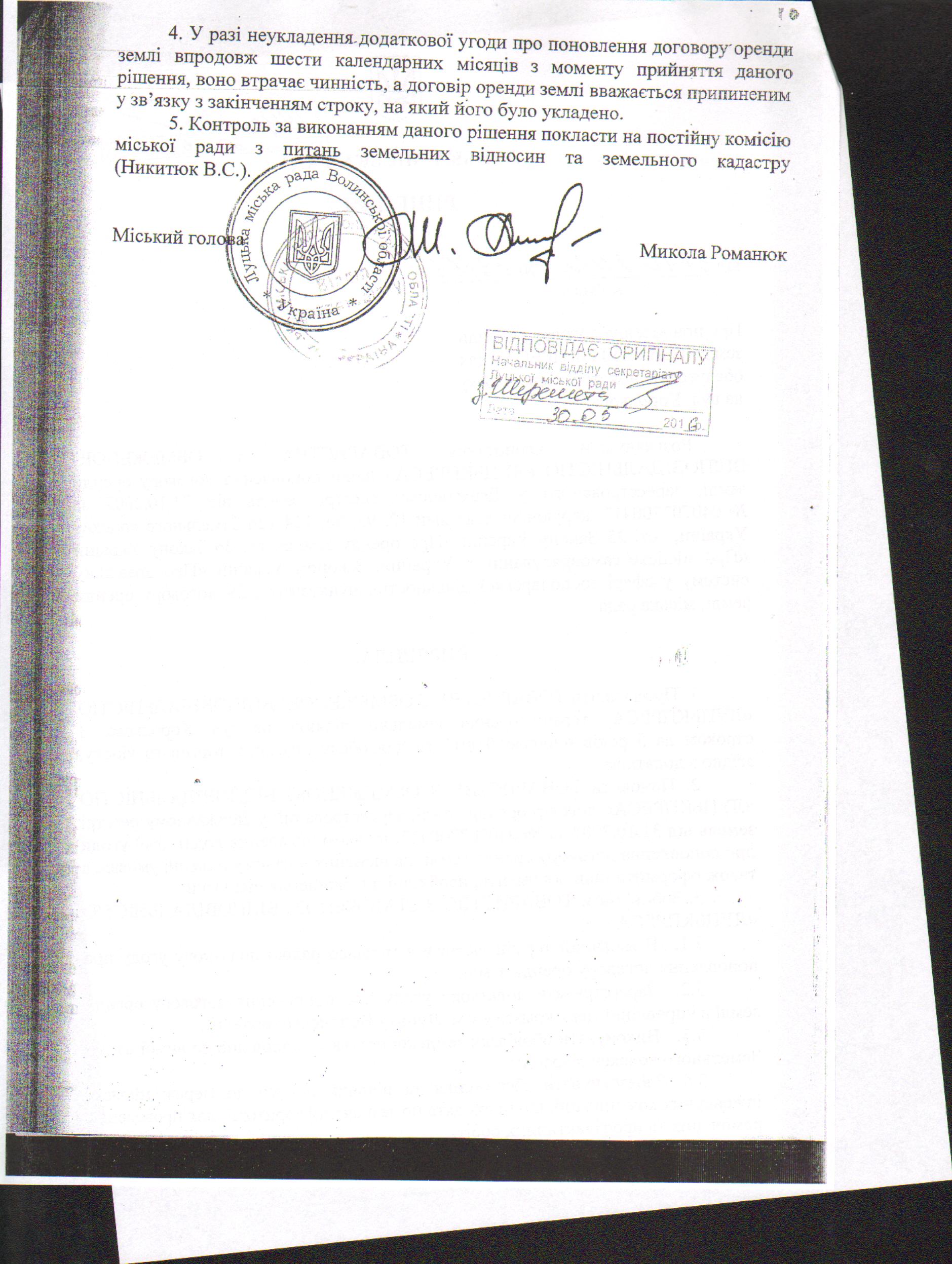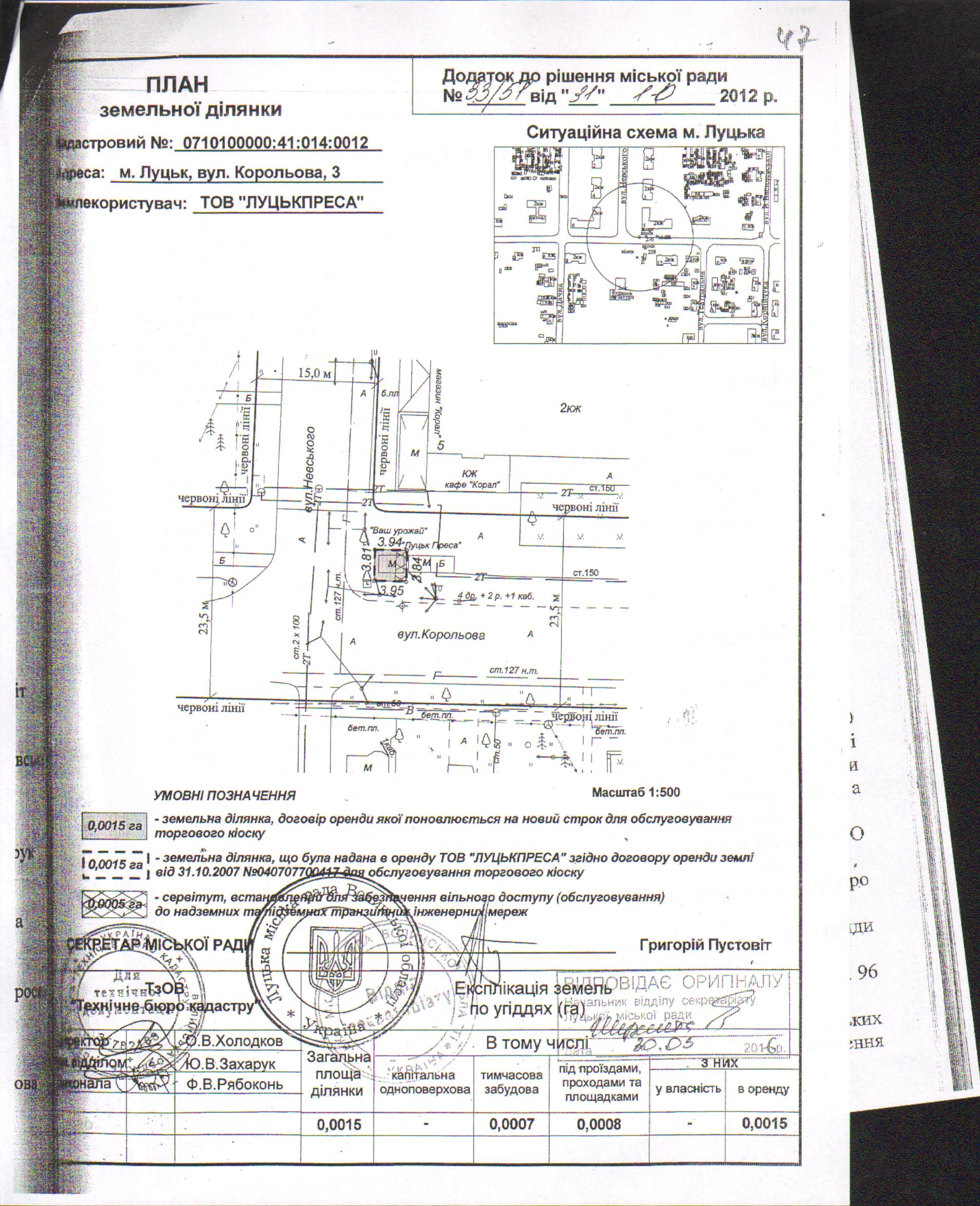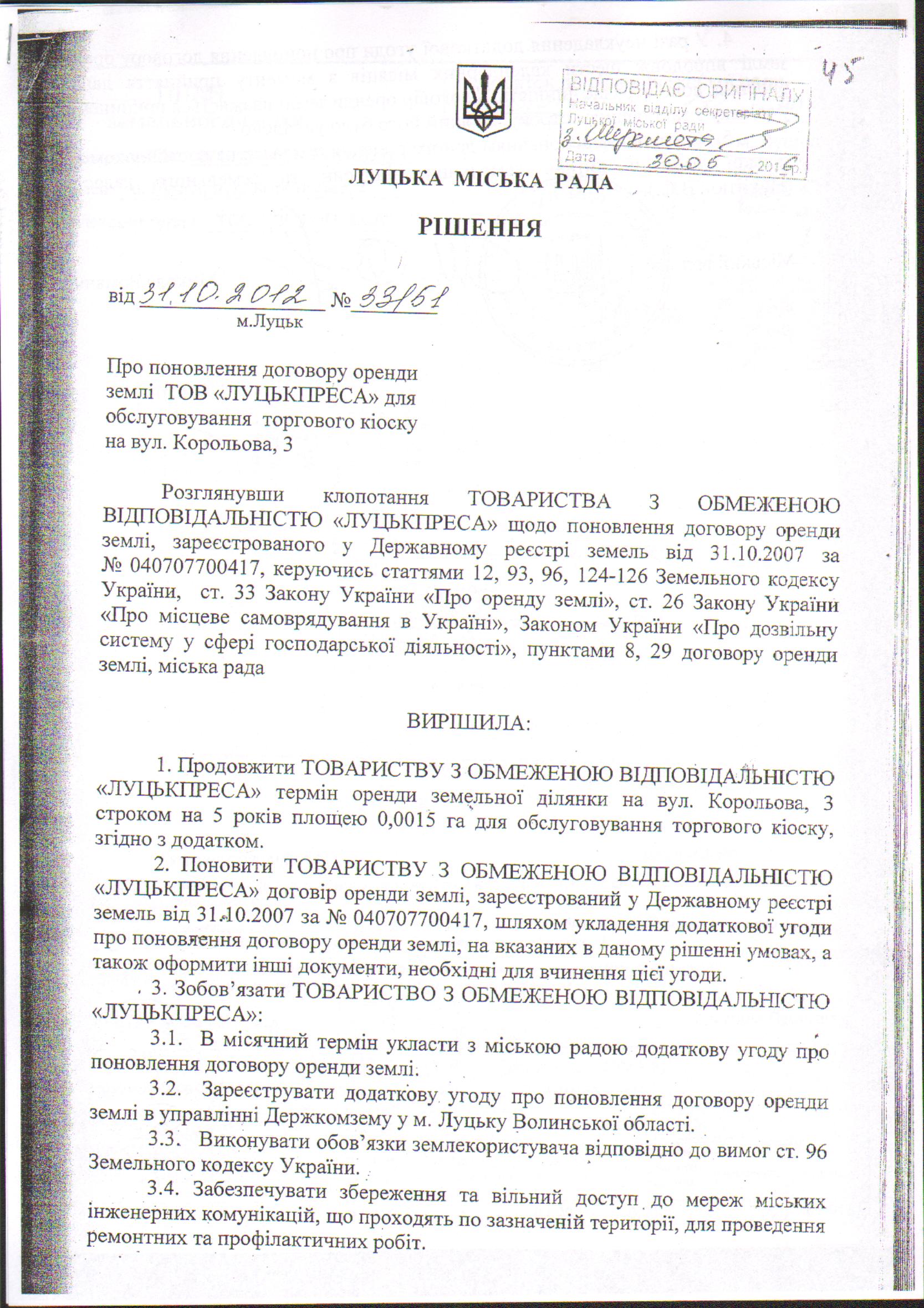 2. Додаткову угоду про поновлення договору оренди землі, зареєстрованого у Державному реєстрі земель від 31.10.2007 за № 040707700417, укладену 26.04.2013 на підставі рішення Луцької міської ради 31.10.2012 № 33/51 «Про поновлення договору оренди землі ТОВ «ЛУЦЬКПРЕСА» для обслуговування торгового кіоску на вул. Корольова, 3», вважати неукладеною, а договір оренди землі припиненим у зв’язку з закінченням строку, на який його було укладено.