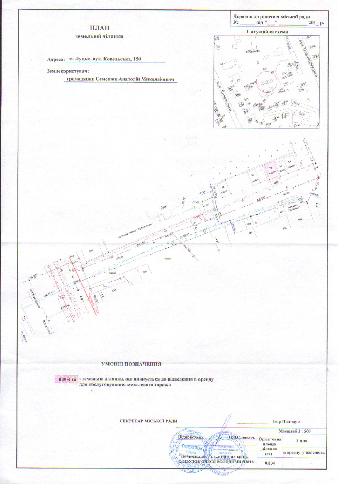 3. Рекомендувати громадянину Семенюку Анатолію Миколайовичу після розроблення загальної схеми генплану розміщення металевих конструкцій (гаражів) на вул. Ковельській, 150 звернутися в Луцьку міську раду для оформлення права оренди земельної ділянки.