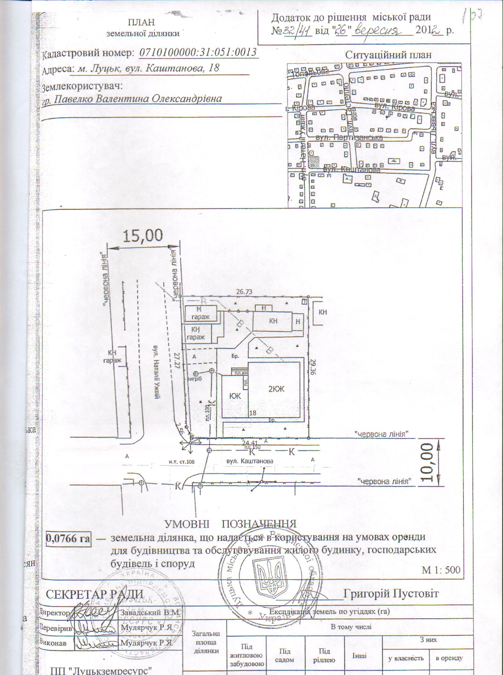 Про внесення змін і доповнень в рішення та додаток до рішення Луцької міської ради від 26.09.2012 № 32/41 «Про надання гр. Павелко В.О. в користування на умовах оренди земельної ділянки для будівництва та обслуговування жилого будинку, господарських будівель і споруд на вул. Каштановій, 18» (площею 0,0766 га)