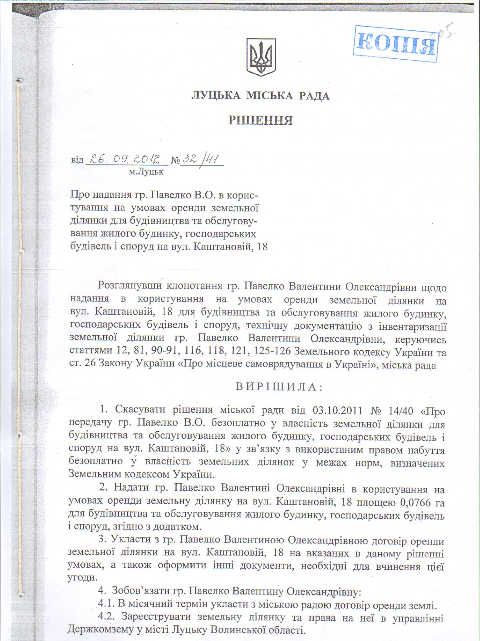 Розглянувши клопотання громадянки Павелко Валентини Олександрівни про внесення змін і доповнень в рішення та додаток до рішення Луцької міської ради від 26.09.2012 № 32/41 «Про надання гр. Павелко В.О. в користування на умовах оренди земельної ділянки для будівництва та обслуговування жилого будинку, господарських будівель і споруд на вул. Каштановій, 18», рішення Луцької міської ради від 26.09.2012 № 32/41 «Про надання гр. Павелко В.О. в користування на умовах оренди земельної ділянки для будівництва та обслуговування жилого будинку, господарських будівель і споруд на вул. Каштановій, 18», витяг з Державного земельного кадастру про земельну ділянку від 22.03.2018 № НВ-0703945342018, технічну документацію із землеустрою щодо встановлення (відновлення) меж земельної ділянки в натурі (на місцевості) на вул. Каштановій, 18, договір оренди землі, укладений між Луцькою міською радою та громадянкою Павелко Валентиною Олександрівною 21.03.2013, відповідно до якого право оренди земельної ділянки в Державному реєстрі речових прав зареєстроване не було, враховуючи інформацію Головного управління Держгеокадастру у Волинській області від 25.04.2018 № П-150/0-167/0/6-18, керуючись статтями 12, 40, 79-1, 122-123, 186 Земельного кодексу України, статтями 4-6, 16, 19 Закону України «Про оренду землі», статтею 16 Закону України “Про державний земельний кадастр”, статтею 4 Закону України «Про державну реєстрацію речових прав на нерухоме майно та їх обтяжень», Законом України «Про внесення змін до деяких законодавчих актів України щодо розмежування земель державної та комунальної власності», статтею 25 Закону України «Про землеустрій», статтею 26 Закону України «Про місцеве самоврядування в Україні», Постановою Кабінету Міністрів України від 17.10.2012 № 1051 «Про затвердження Порядку ведення Державного земельного кадастру», рішенням Луцької міської ради від 26.11.2015 № 112 «Про затвердження персонального складу постійних комісій Луцької міської ради», міська рада