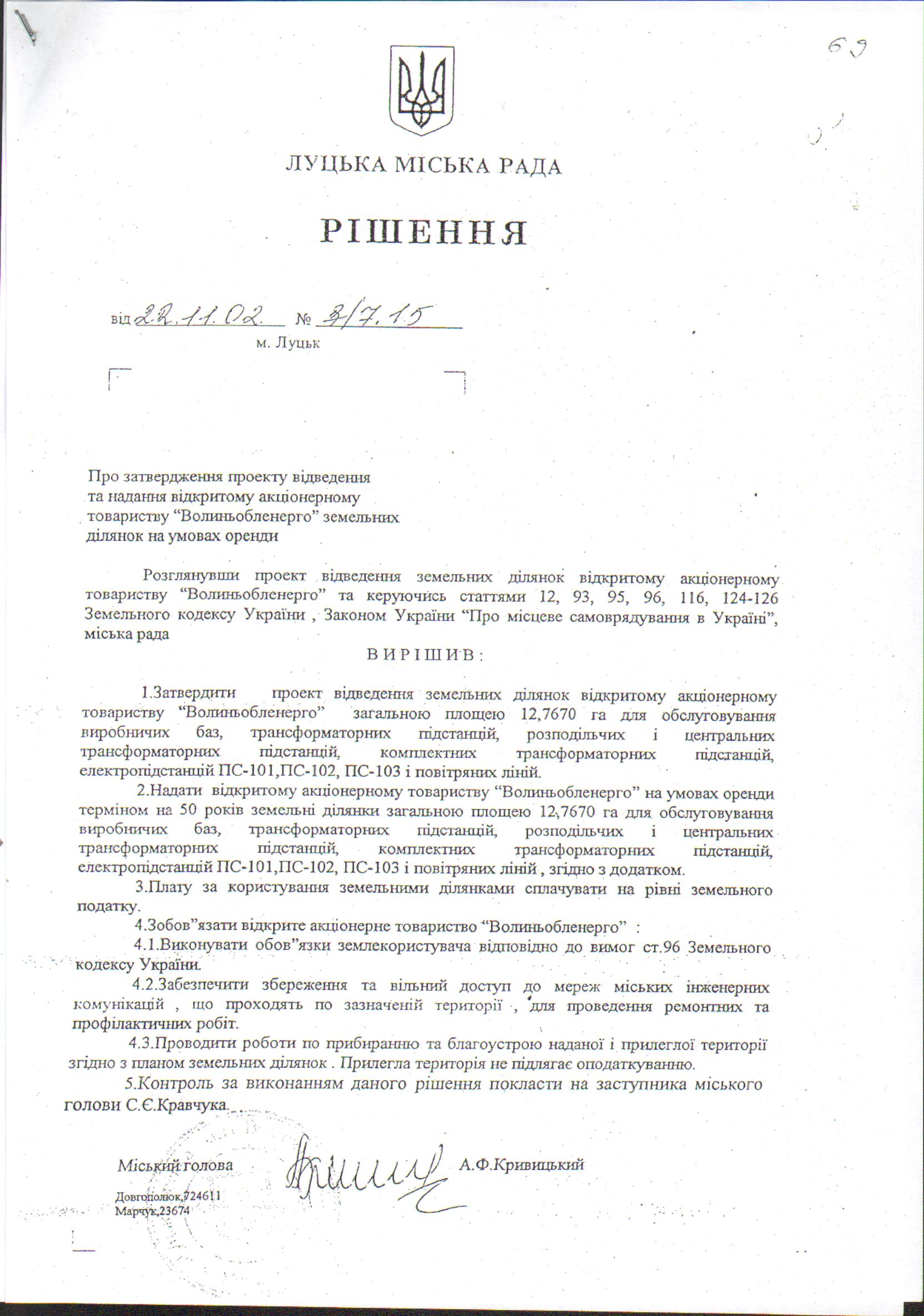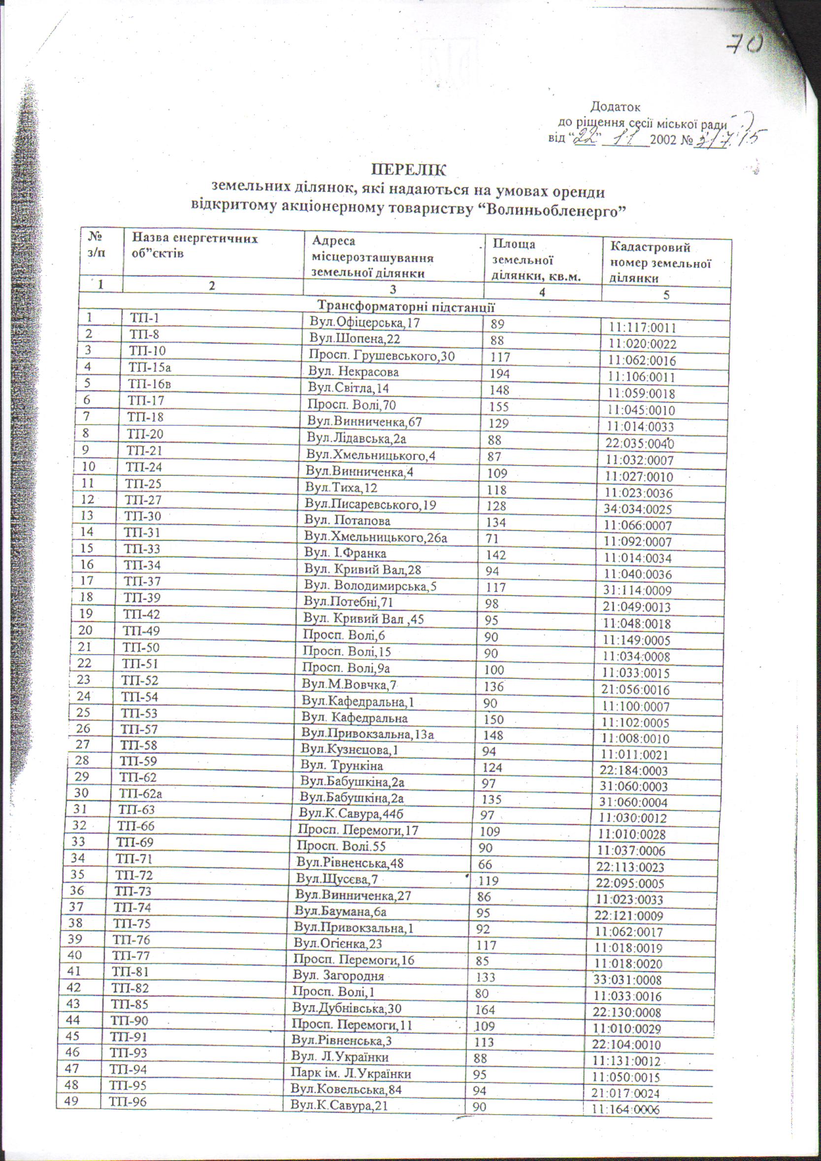 Розглянувши клопотання ПРИВАТНОГО АКЦІОНЕРНОГО ТОВАРИСТВА «ВОЛИНЬОБЛЕНЕРГО» щодо внесення змін в додаток до рішення Луцької міської ради від 22.11.2002 № 3/7.15 «Про затвердження проекту відведення та надання відкритому акціонерному товариству «Волиньобленерго» земельних ділянок на умовах оренди», рішення Луцької міської ради від 22.11.2002 № 3/7.15 «Про затвердження проекту відведення та надання відкритому акціонерному товариству «Волиньобленерго» земельних ділянок на умовах оренди», із змінами внесеними рішенням Луцької міської ради від 29.10.2014 № 65/74 «Про внесення змін та доповнень в рішення та додаток до рішення міської ради від 22.11.2002 № 3/7.15 «Про затвердження проекту відведення та надання відкритому акціонерному товариству «Волиньобленерго» земельних ділянок на умовах оренди» та рішенням Луцької міської ради від 03.07.2017 № 26/76 «Про внесення змін в рішення міської ради від 29.10.2014 № 65/74 «Про внесення змін та доповнень в рішення та додаток до рішення міської ради від 22.11.2002 № 3/7.15 «Про затвердження проекту відведення та надання відкритому акціонерному товариству «Волиньобленерго» земельних ділянок на умовах оренди», витяг з Державного земельного кадастру про земельну ділянку від 25.01.2018 № НВ-0703765752018, лист Головного управління Держгеокадастру у Волинської області від 27.03.2018 № 28-3-0.2220-2285/2-18, розпорядження Луцького міського голови від 01.04.2014 № 135 «Про присвоєння поштової адреси об’єкту нерухомості на вул. Винниченка, 16-в ПАТ «Волиньобленерго», керуючись статтями 12, 93 Земельного кодексу України, Законом України «Про Державний земельний кадастр», Законом України «Про державну реєстрацію речових прав на нерухоме майно та їх обтяжень», Законом України «Про внесення змін до деяких законодавчих актів України щодо розмежування земель державної та комунальної власності», статтею 26 Закону України «Про місцеве самоврядування в Україні», Постановою Кабінету Міністрів України від 17.10.2012 № 1051 «Про затвердження Порядку ведення Державного земельного кадастру», міська рада