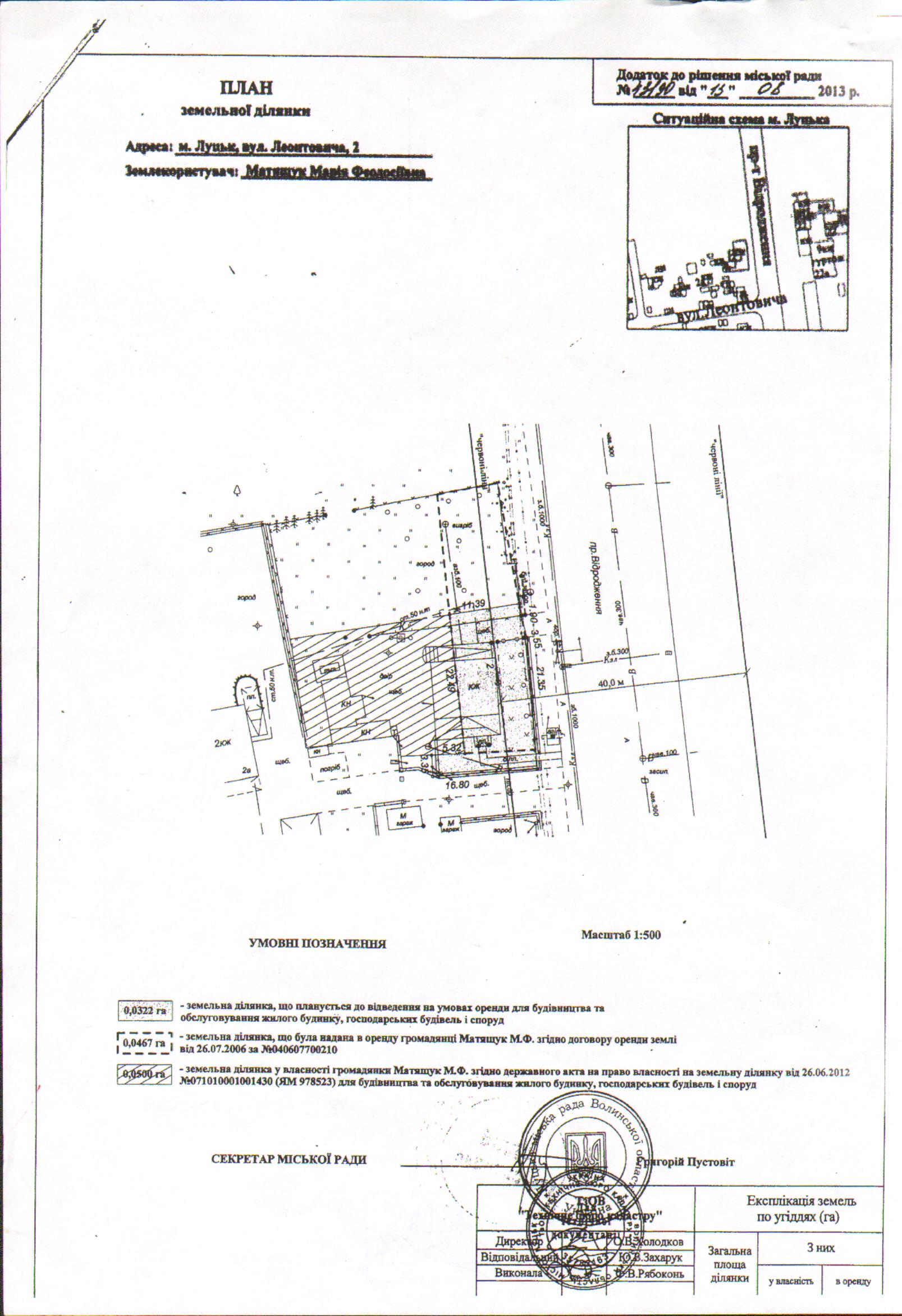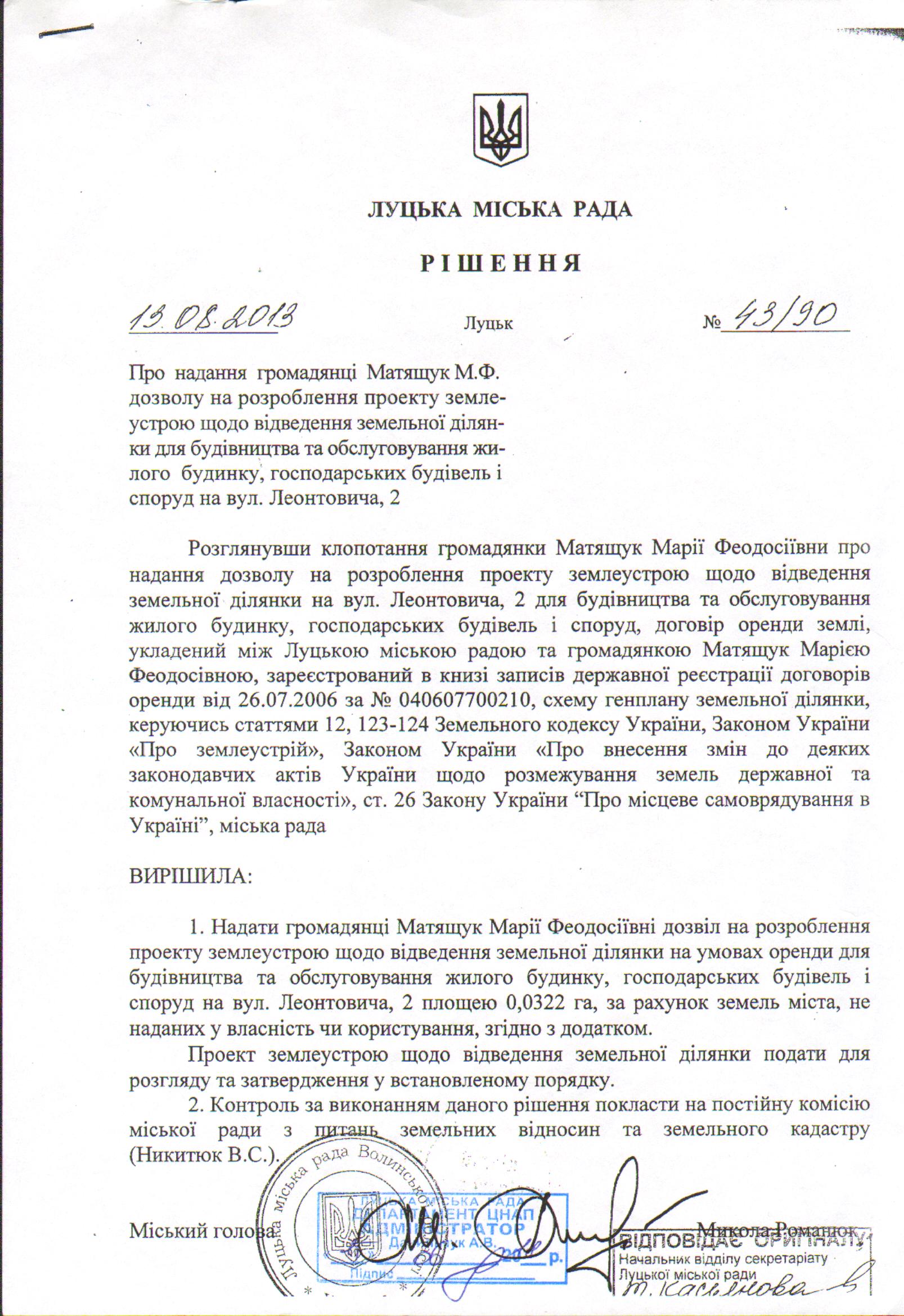 1. Внести зміни в рішення та додаток до рішення Луцької міської ради від 13.08.2013 № 43/90 “Про надання громадянці Матящук М.Ф. дозволу на розроблення проекту землеустрою щодо відведення земельної ділянки для будівництва та обслуговування жилого будинку, господарських будівель і споруд на вул. Леонтовича, 2”, виклавши його в новій редакції: