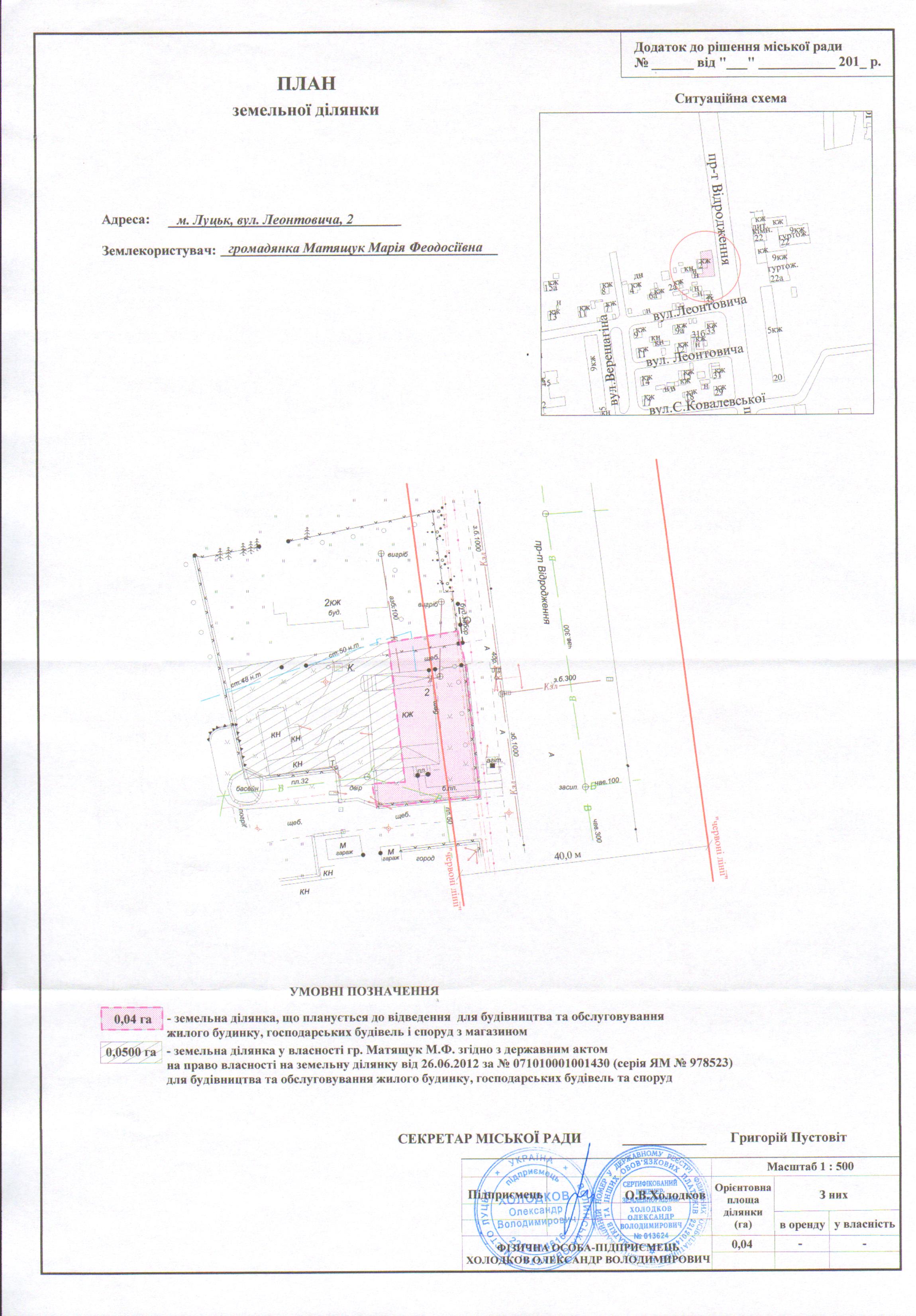 “1. Надати громадянці Матящук Марії Феодосіївні дозвіл на розроблення проекту землеустрою щодо відведення земельної ділянки на умовах оренди для будівництва та обслуговування жилого будинку, господарських будівель і споруд з магазином на вул. Леонтовича, 2, орієнтовною площею 0,04 га, з земель комунальної власності, згідно з додатком.