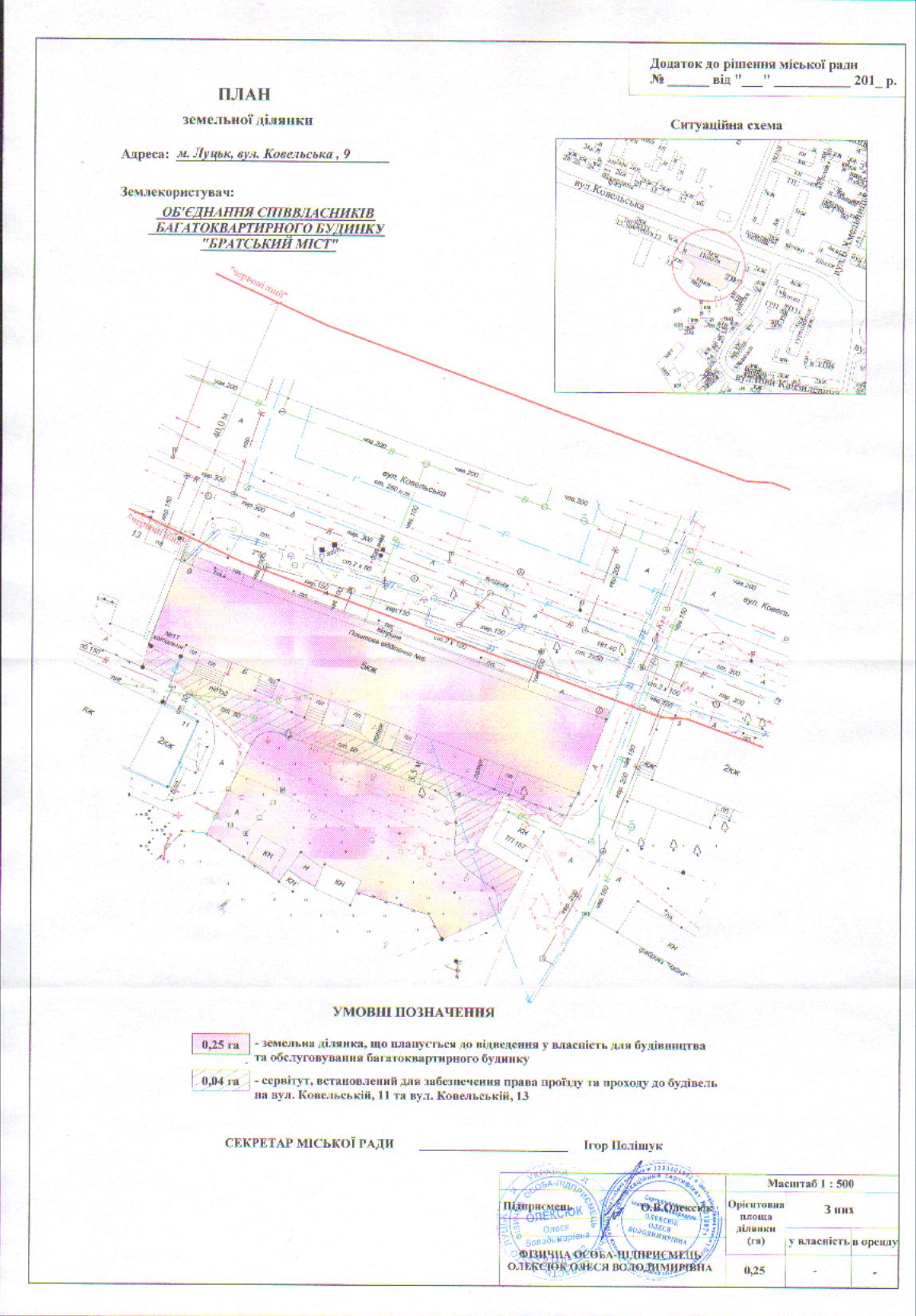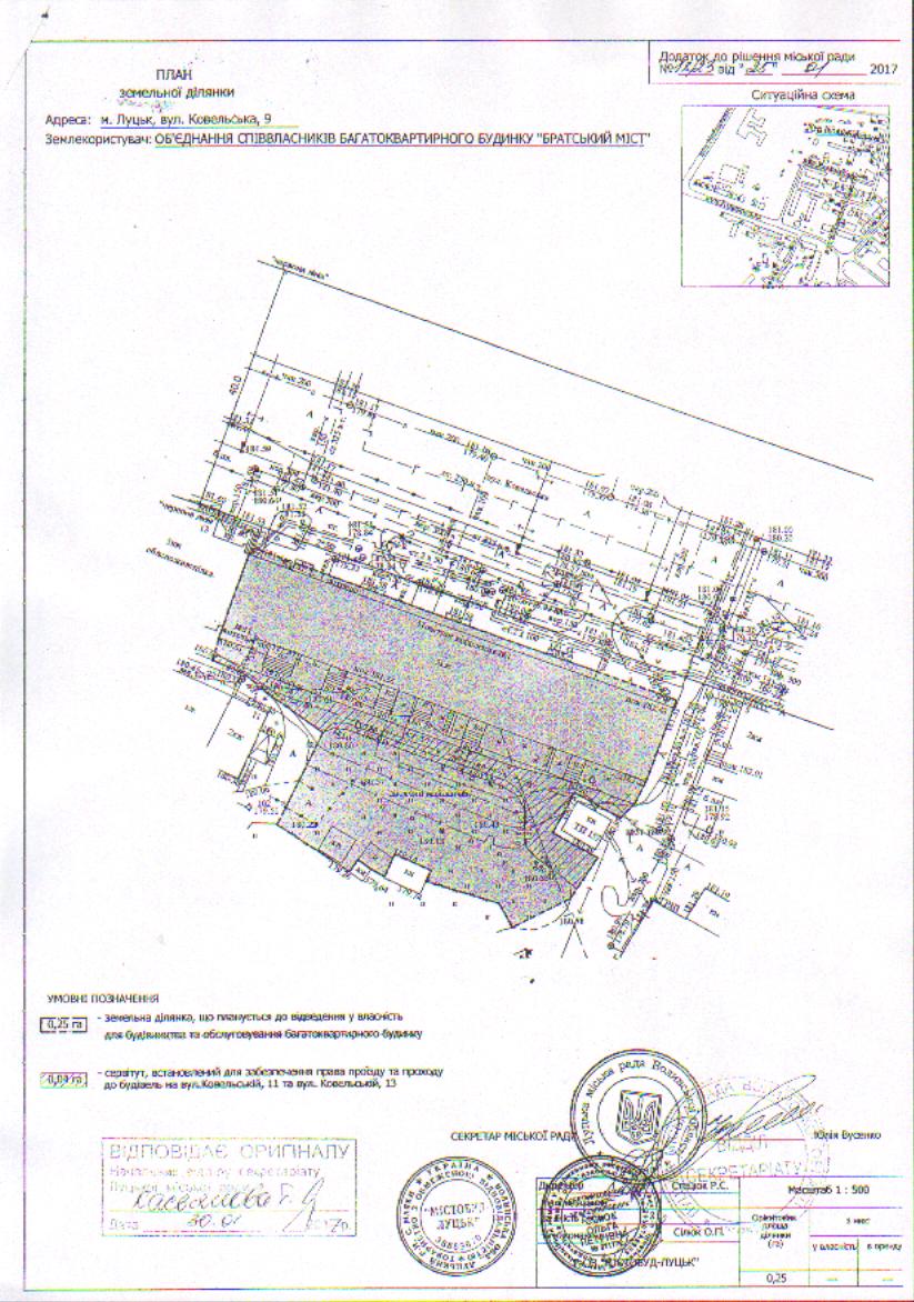 2. ОБ’ЄДНАННЮ СПІВВЛАСНИКІВ БАГАТОКВАРТИРНОГО БУДИНКУ «БРАТСЬКИЙ МІСТ» подати на затвердження розроблений проект землеустрою щодо відведення у власність земельної ділянки на вул. Ковельській, 9 орієнтовною площею 0,25 га для будівництва та обслуговування багатоквартирного будинку в порядку, визначеному чинним законодавством України. »