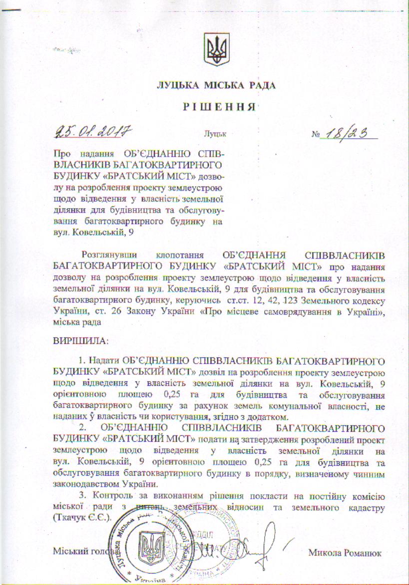 Розглянувши клопотання ОБ’ЄДНАННЯ СПІВВЛАСНИКІВ БАГАТОКВАРТИРНОГО БУДИНКУ «БРАТСЬКИЙ МІСТ» щодо внесення змін до рішення Луцької міської ради від 25.01.2017 № 18/23 «Про надання ОБ’ЄДНАННЮ СПІВВЛАСНИКІВ БАГАТОКВАРТИРНОГО БУДИНКУ «БРАТСЬКИЙ МІСТ» дозволу на розроблення проекту землеустрою щодо відведення у власність земельної ділянки для будівництва та обслуговування багатоквартирного будинку на вул. Ковельській, 9» у зв’язку з уточненням існуючих меж земельної ділянки, що межує з земельною ділянкою, яку передбачається відвести у власність об’єднання, керуючись статтями 12, 42, 123 Земельного кодексу України, ст. 26 Закону України «Про місцеве самоврядування в Україні», міська рада