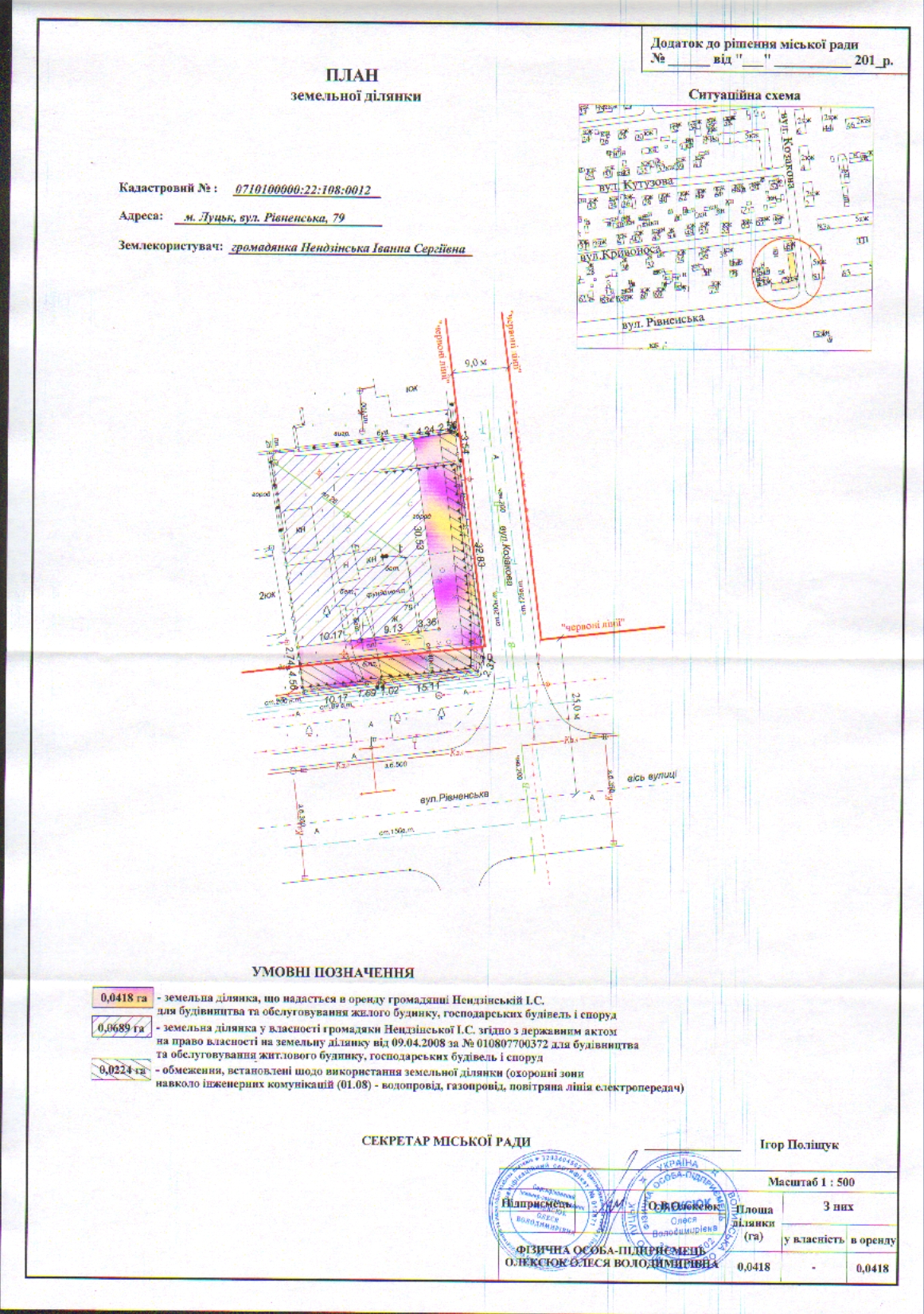 Розглянувши клопотання громадянки Нендзінської Іванни Сергіївни про внесення змін і доповнень в рішення та додаток до рішення Луцької міської ради від 22.10.2008 № 31/39 «Про припинення договору оренди та надання земельної ділянки на умовах оренди гр. Нендзінській І.С. для обслуговування житлового будинку та господарських будівель і споруд на вул. Рівненській, 79», рішення Луцької міської ради від 22.10.2008 № 31/39 «Про припинення договору оренди та надання земельної ділянки на умовах оренди гр. Нендзінській І.С. для обслуговування житлового будинку та господарських будівель і споруд на вул. Рівненській, 79», витяг з Державного земельного кадастру про земельну ділянку від 05.09.2016 № НВ-0702298452016, технічну документацію із землеустрою щодо встановлення (відновлення) меж земельної ділянки в натурі (на місцевості) на вул. Рівненській, 79, враховуючи рішення Луцької міської ради від 25.07.2007 № 16/25 «Про затвердження плану червоних ліній вулиць м. Луцька (перша черга)» та від 22.10.2008 № 31/104 «Про затвердження планів червоних ліній вулиць м. Луцька (третя черга)», керуючись статтями 12, 40, 79-1, 120, 122, 123, 186 Земельного кодексу України, Законом України «Про оренду землі», Законом України «Про державну реєстрацію речових прав на нерухоме майно та їх обтяжень», Законом України «Про внесення змін до деяких законодавчих актів України щодо розмежування земель державної та комунальної власності», статтею 25 Закону України «Про землеустрій», статтею 26 Закону України «Про місцеве самоврядування в Україні», пунктом 34 Постанови Кабінету Міністрів України від 17.10.2012 № 1051 «Про затвердження Порядку ведення Державного земельного кадастру», рішенням Луцької міської ради від 26.11.2015 № 112 «Про затвердження персонального складу постійних комісій Луцької міської ради», міська рада