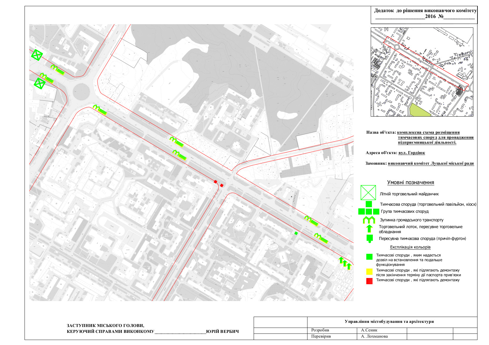 З метою впорядкування розміщення тимчасових споруд для провадження підприємницької діяльності на вулиці Гордіюк, враховуючи рекомендації п.2 протоколу № 23 від 12.11.2016 засідання робочої групи з погодження місця розташування та функціонування тимчасових споруд для провадження підприємницької діяльності на території міста Луцька, керуючись ст. 30 Закону України «Про місцеве самоврядування в Україні», ст. 28 Закону України «Про регулювання містобудівної діяльності», виконавчий комітет міської ради