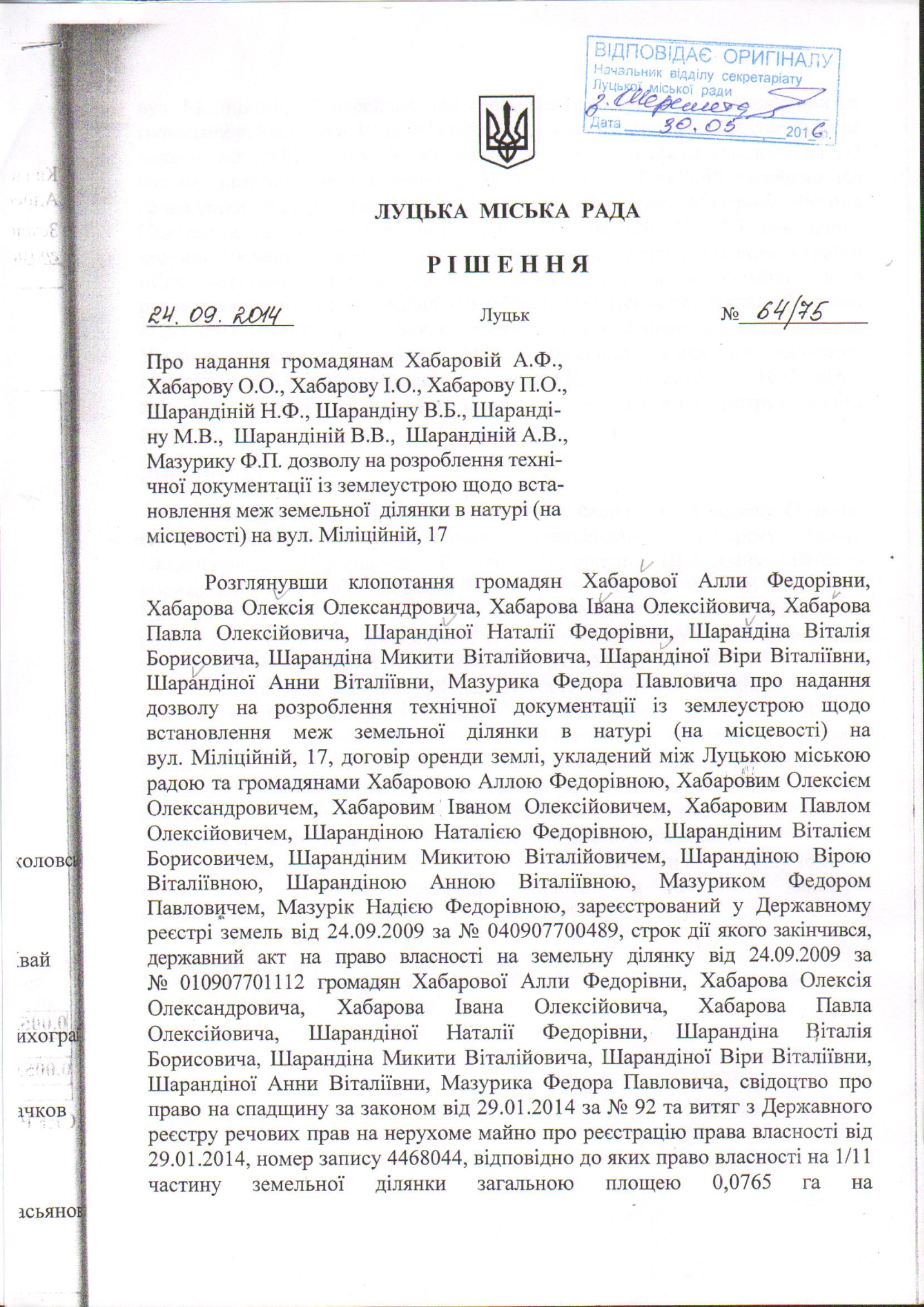 Розглянувши клопотання громадян Хабарової Алли Федорівни, Хабарова Олексія Олександровича, Хабарова Івана Олексійовича, Хабарова Павла Олексійовича, Шарандіної Наталії Федорівни, Шарандіна Віталія Борисовича, Шарандіна Микити Віталійовича, Шарандіної Віри Віталіївни, Шарандіної Анни Віталіївни про внесення змін в рішення Луцької міської ради від 24.09.2014 № 64/75 «Про надання громадянам Хабаровій А.Ф., Хабарову О.О., Хабарову І.О., Хабарову П.О., Шарандіній Н.Ф., Шарандіну В.Б., Шарандіну М.В., Шарандіній В.В., Шарандіній А.В., Мазурику Ф.П. дозволу на розроблення технічної документації із землеустрою щодо встановлення меж земельної ділянки в натурі (на місцевості) на вул. Міліційній, 17» у зв’язку із смертю громадянина Мазурика Федора Павловича (свідоцтво про смерть від 29.01.2015, серія І-ЕГ № 168080), договір оренди землі, укладений між Луцькою міською радою та громадянами Хабаровою Аллою Федорівною, Хабаровим Олексієм Олександровичем, Хабаровим Іваном Олексійовичем, Хабаровим Павлом Олексійовичем, Шарандіною Наталією Федорівною, Шарандіним Віталієм Борисовичем, Шарандіним Микитою Віталійовичем, Шарандіною Вірою Віталіївною, Шарандіною Анною Віталіївною, Мазуриком Федором Павловичем, Мазурік Надією Федорівною, зареєстрований у Державному реєстрі земель від 24.09.2009 за № 040907700489, акт приймання-передачі земельної ділянки від 11.04.2016, враховуючи свідоцтва про право на спадщину за законом від 03.08.2015 за № 3-871 та № 3-872, на підставі яких право власності по 1/2 частці квартири № 3 в будинку № 17 на вул. Міліційній перейшло до громадян Хабарової Алли Федорівни та Шарандіної Наталії Федорівні, свідоцтва про право на спадщину за законом від 03.08.2015 за № 3-869 та № 3-370, на підставі яких по 1/11 частці земельної ділянки загальної площі 0,0765 га перейшло до громадян Хабарової Алли Федорівни та Шарандіної Наталії Федорівні; керуючись статтями 12, 120, 122, 123, 186 Земельного кодексу України, статтею 7 Закону України «Про оренду землі», Законом України «Про внесення змін до деяких законодавчих актів України щодо розмежування земель державної та комунальної власності», статтею 25 Закону України «Про землеустрій», статтею 26 Закону України «Про місцеве самоврядування в Україні», рішенням Луцької міської ради від 26.11.2015 № 112 «Про затвердження персонального складу постійних комісій Луцької міської ради», міська рада