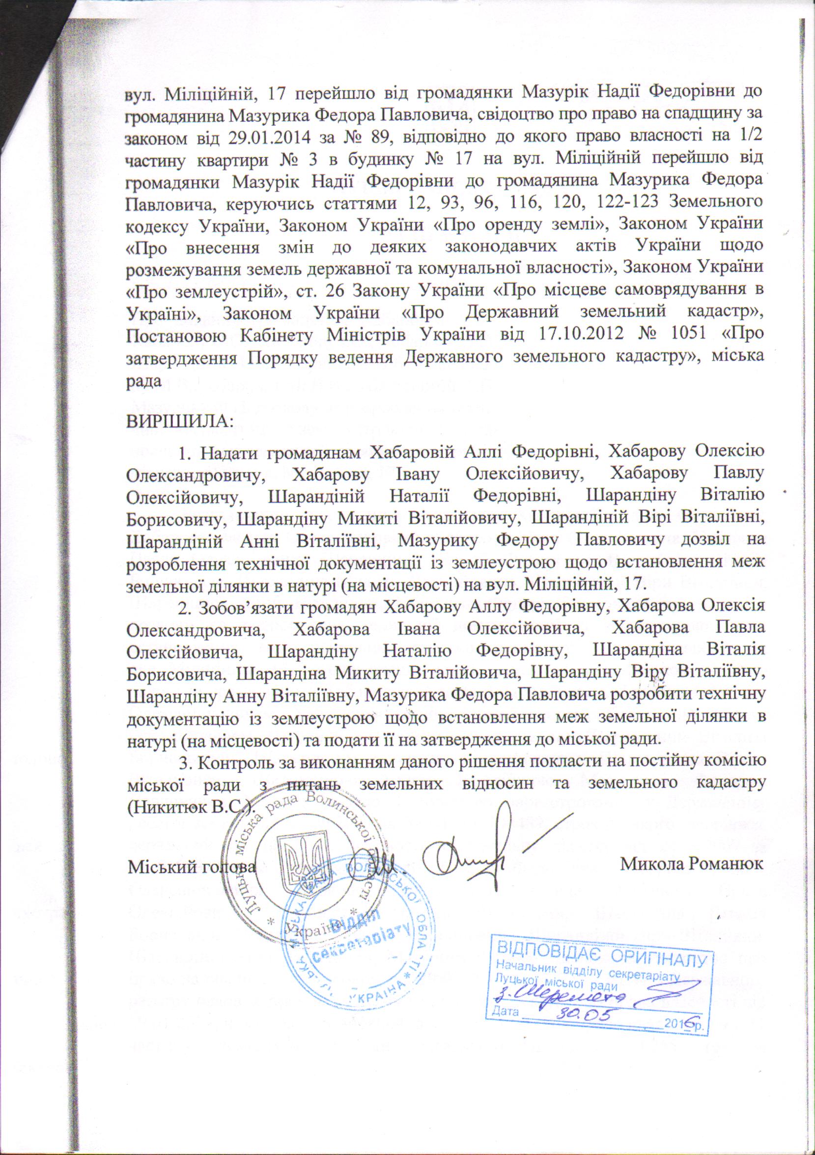«1. Надати громадянам Хабаровій Аллі Федорівні, Хабарову Олексію Олександровичу, Хабарову Івану Олексійовичу, Хабарову Павлу Олексійовичу, Шарандіній Наталії Федорівні, Шарандіну Віталію Борисовичу, Шарандіну Микиті Віталійовичу, Шарандіній Вірі Віталіївні, Шарандіній Анні Віталіївні дозвіл на розроблення технічної документації із землеустрою щодо встановлення (відновлення) меж земельної ділянки в натурі (на місцевості) на вул. Міліційній, 17, площею 0,0072 га.