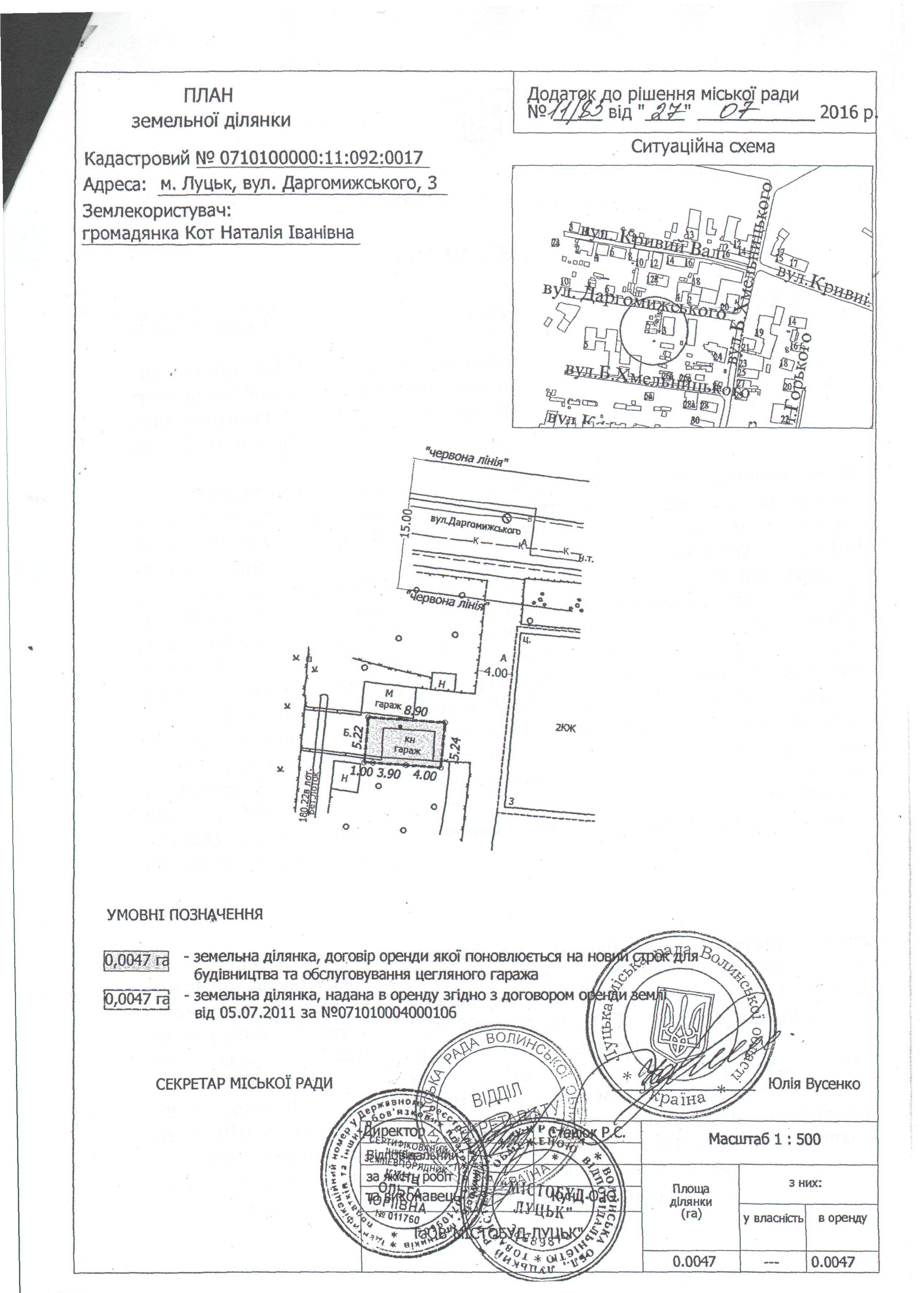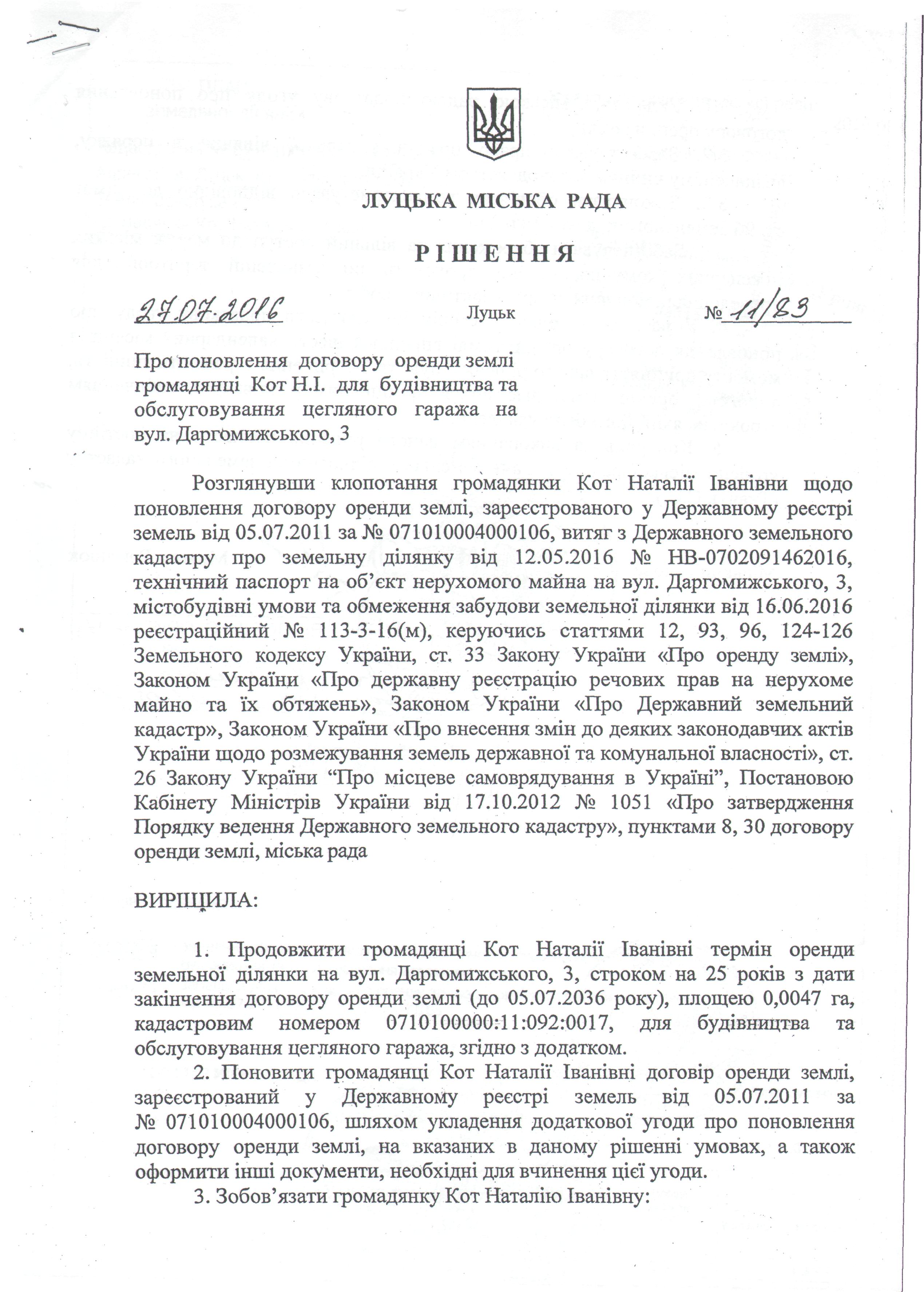 1. Внести зміни в п. 1 рішення міської ради від 27.07.2016 № 11/83 «Про поновлення договору оренди землі громадянці Кот Н.І. для будівництва та обслуговування цегляного гаража на вул. Даргомижського, 3», замінивши дату закінчення договору оренди землі «(до 05.07.2036)» на дату закінчення договору оренди землі «(до 05.07.2041)».