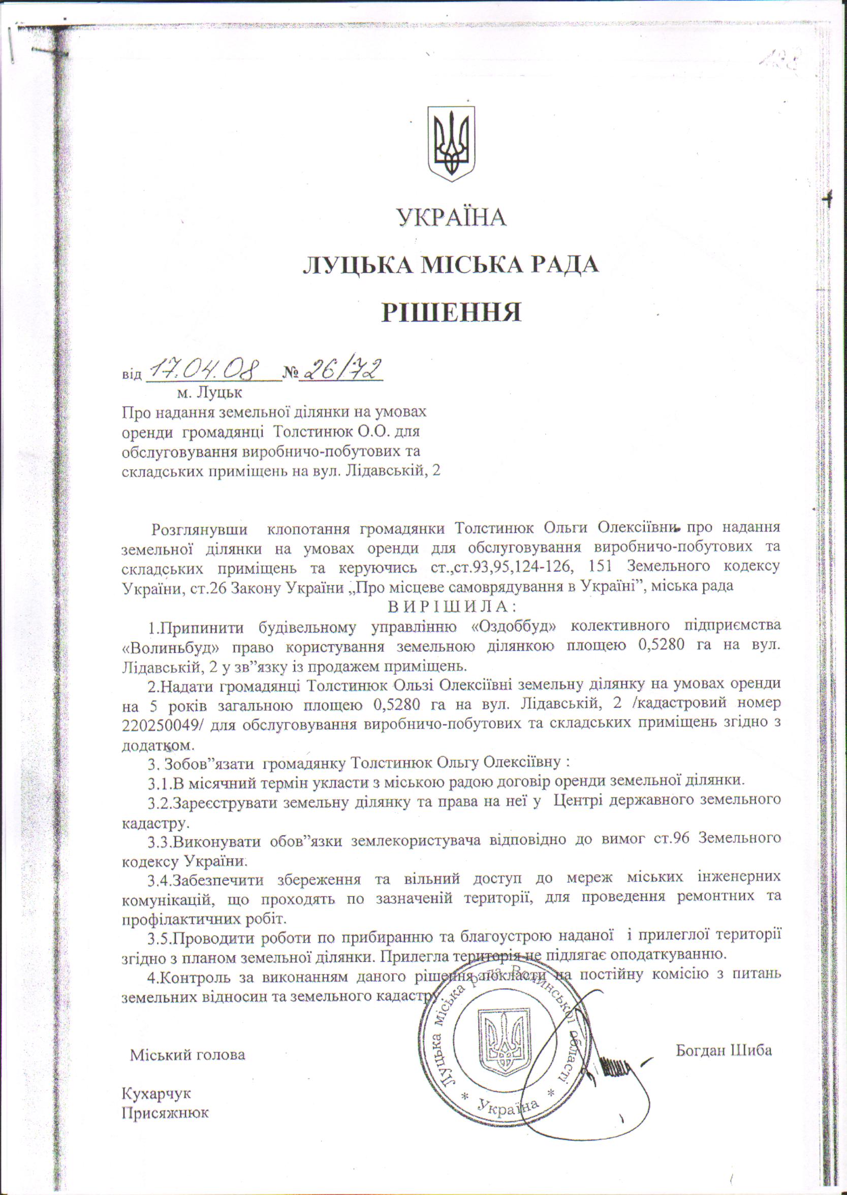 Про визнання нечинними пункти 2-3 рішення міської ради від 17.04.2008 № 26/72 «Про надання земельної ділянки на умовах оренди громадянці Толстинюк О.О. для обслуговування виробничо-побутових та складських приміщень на вул. Лідавській, 2».