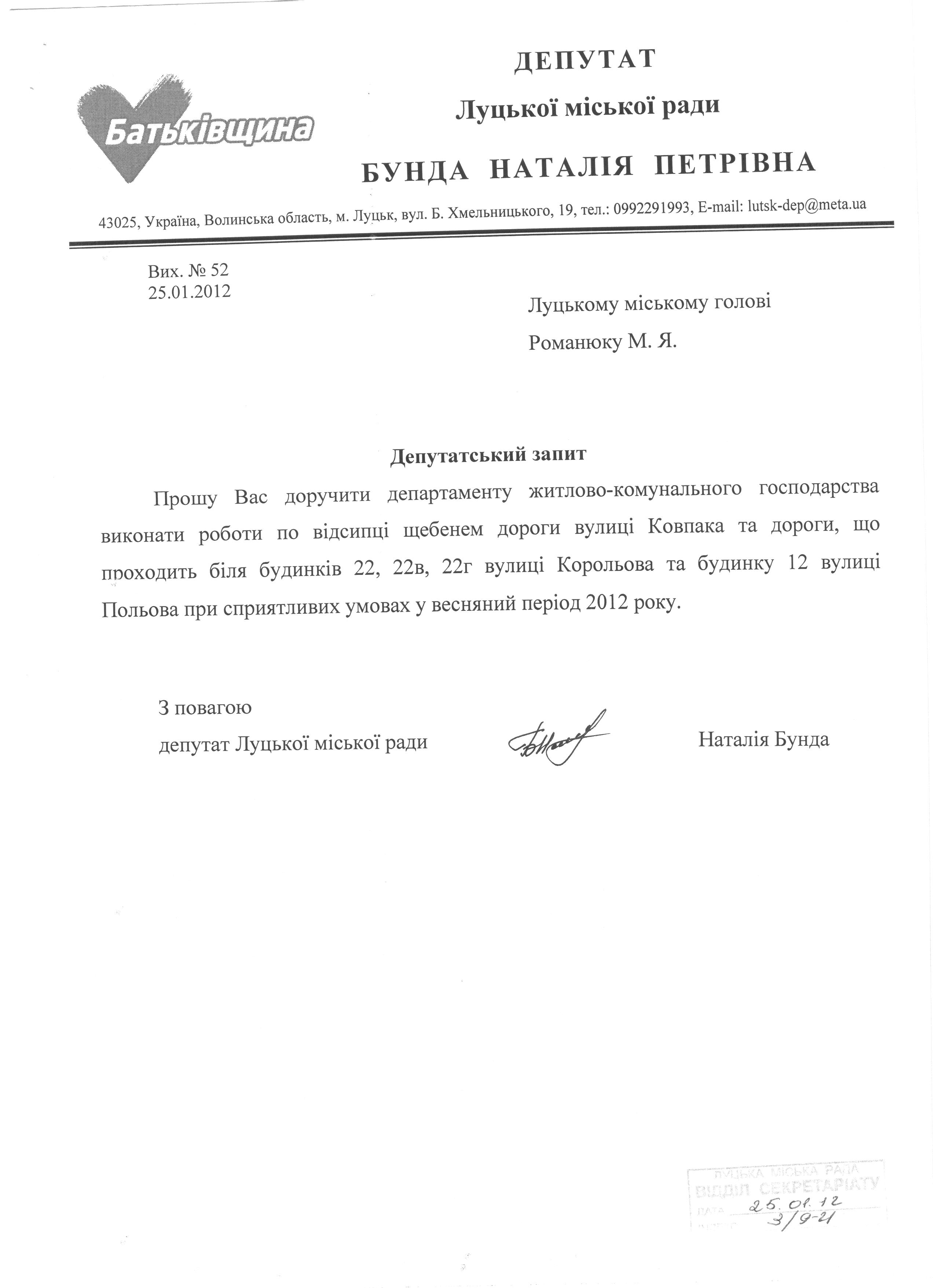 Про запит депутата міської ради Бунди Н.П. щодо відсипки щебенем вулиць Ковпака, Корольова, Польової