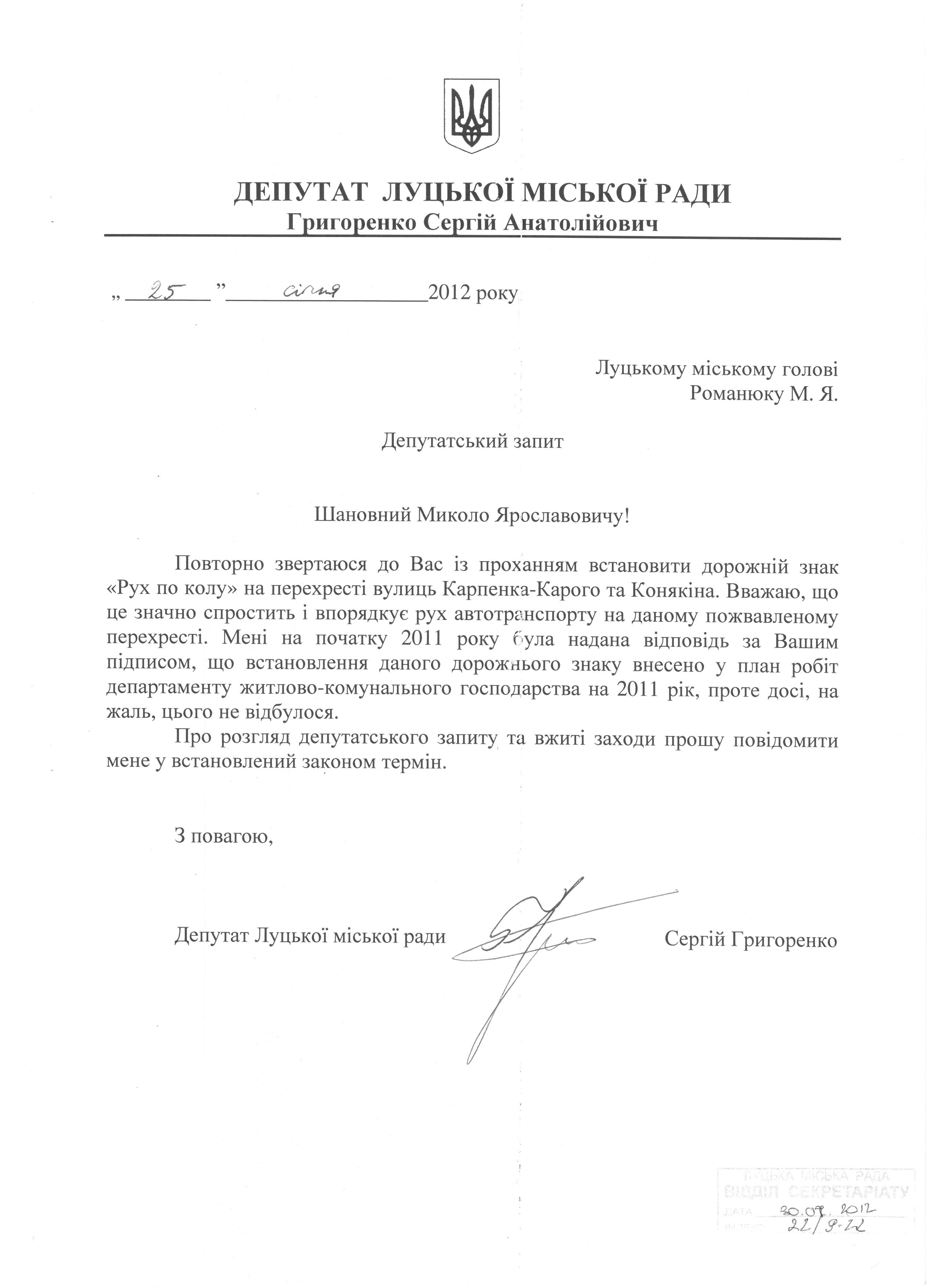 1. Підтримати запит депутата міської ради Григоренка С.А. до міського голови Романюка М.Я. щодо встановлення дорожнього знаку «Круговий рух» на перехресті вулиць Карпенка-Карого та Конякіна (додається).