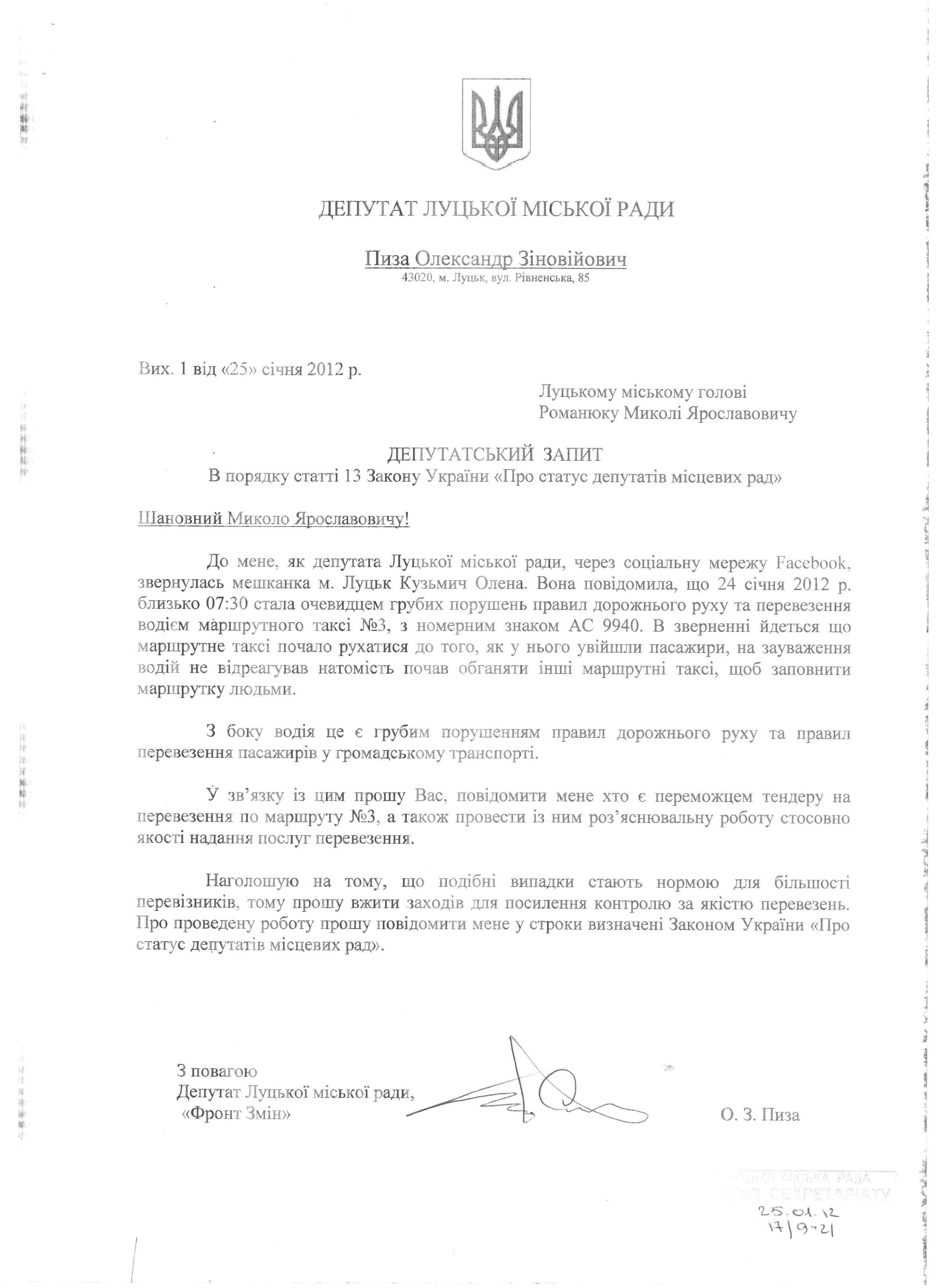 1. Підтримати запит депутата міської ради Пизи О.З. до міського голови Романюка М.Я. щодо порушення правил дорожнього руху та правил перевезення пасажирів водієм маршрутного таксі №3 (додається).