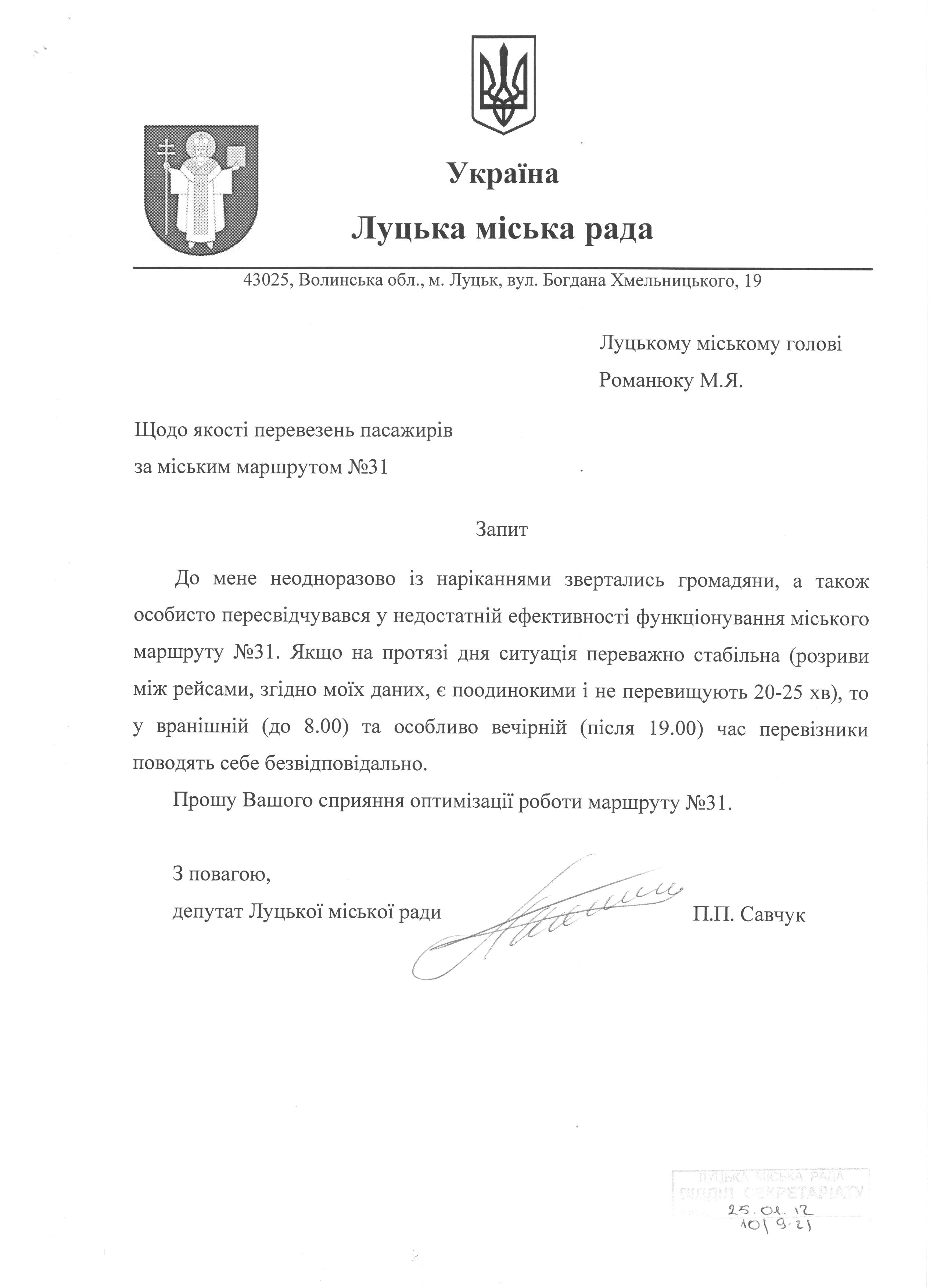 1. Підтримати запит депутата міської ради Савчука П.П. до міського голови Романюка М.Я. щодо оптимізації руху за міським маршрутом № 31 (додається).
