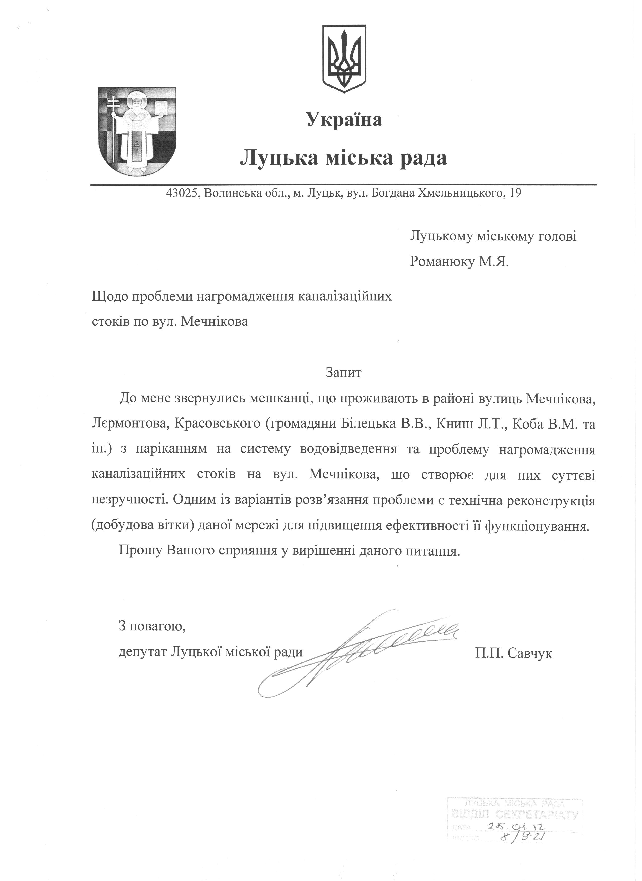 1. Підтримати запит депутата міської ради Савчука П.П. до міського голови Романюка М.Я. щодо вирішення проблеми нагромадження каналізаційних стоків на вул. Мечнікова (додається).