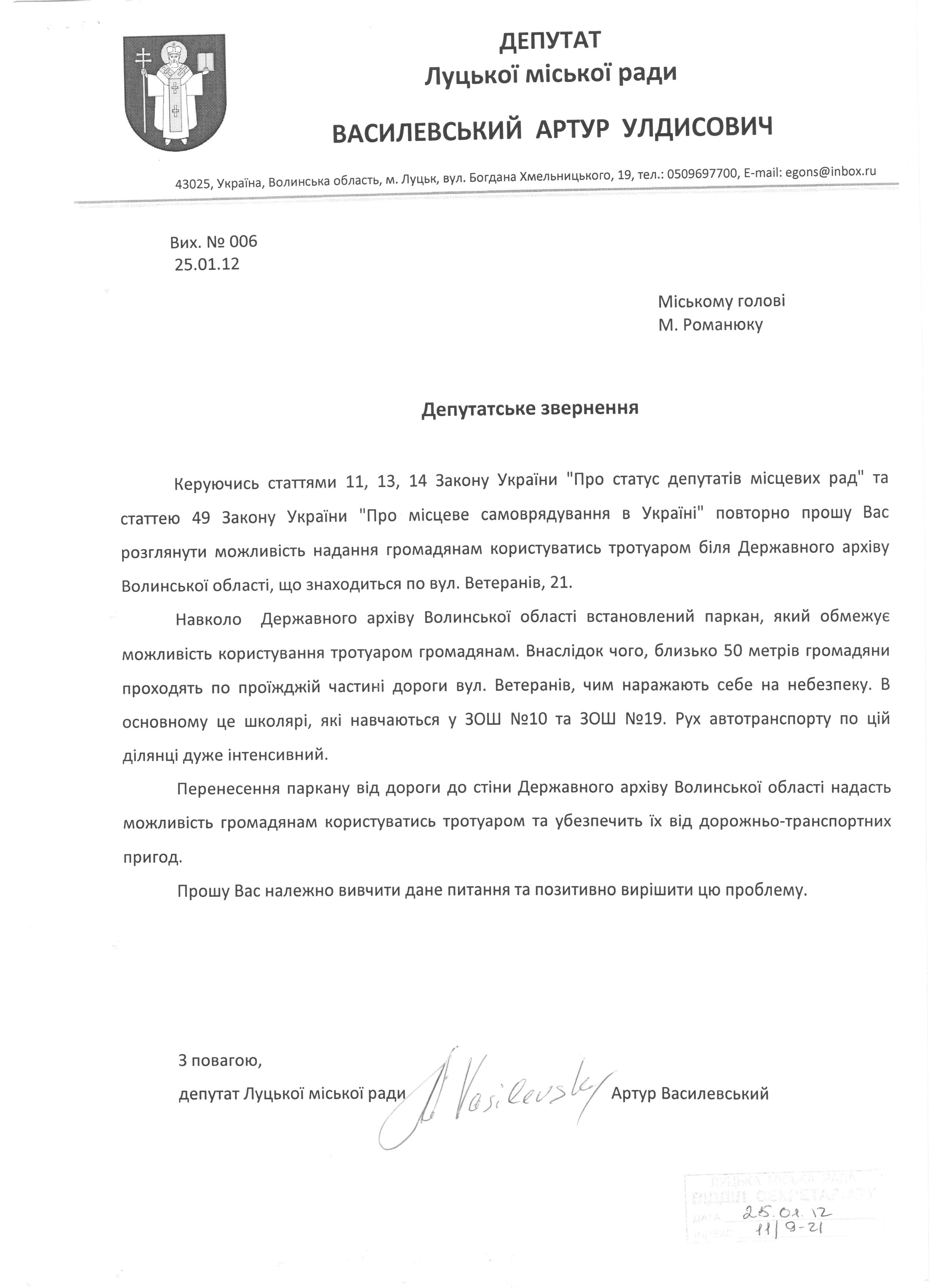 Про запит депутата міської ради Василевського А.У. щодо відкриття руху для пішоходів по тротуару біля Державного архіву Волинської області на вул. Ветеранів, 21