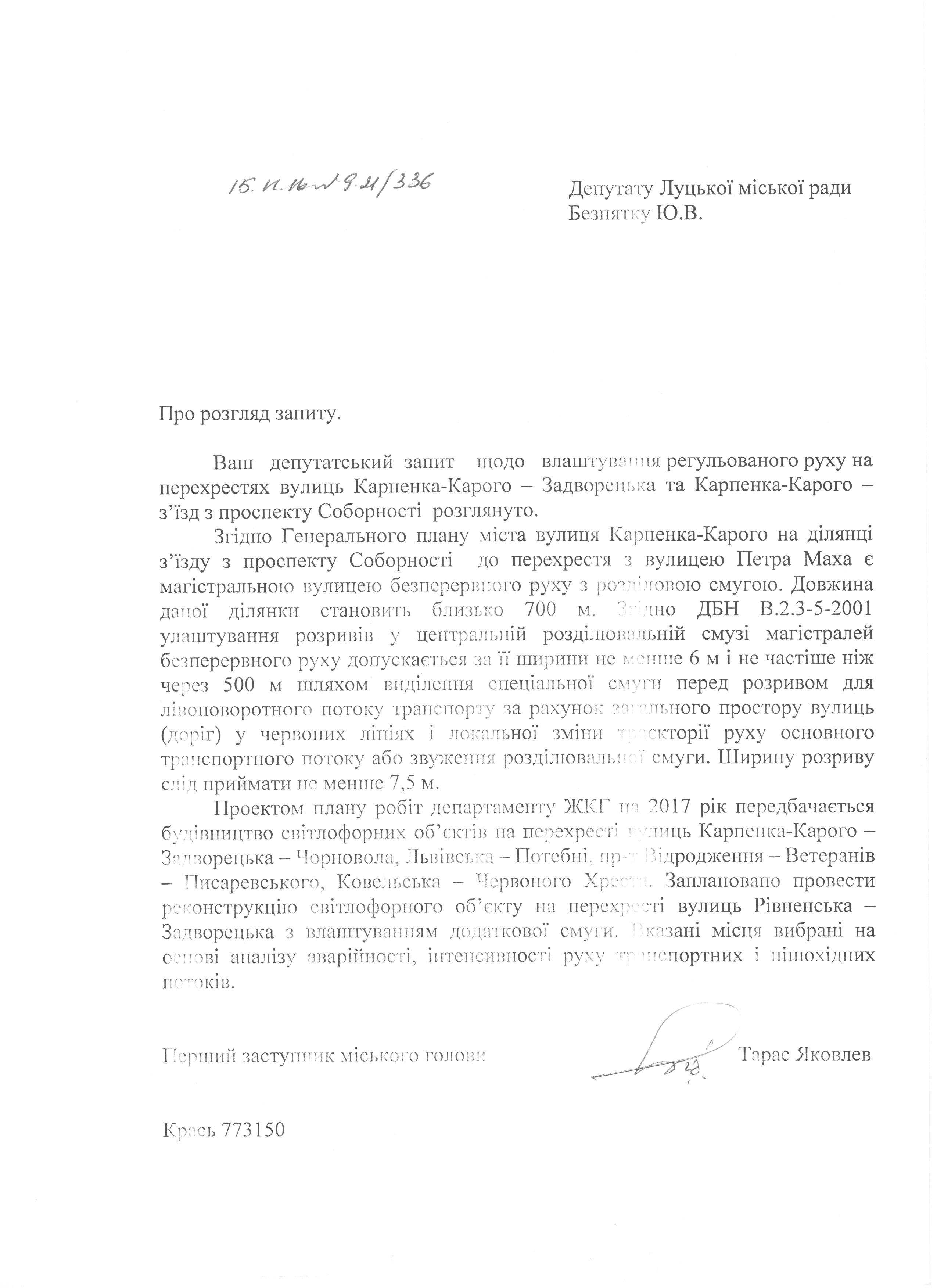 Про запит депутата міської ради Безпятка Ю.В. щодо влаштування світлофорів на перехрестях