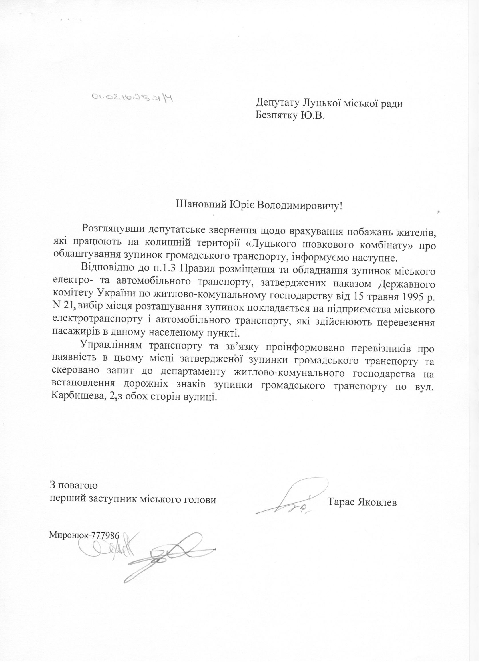 1. Підтримати запит депутата міської ради Безпятка Ю.В. до міського голови Романюка М.Я. щодо влаштування зупинки громадського транспорту на вул. Карбишева (додається).