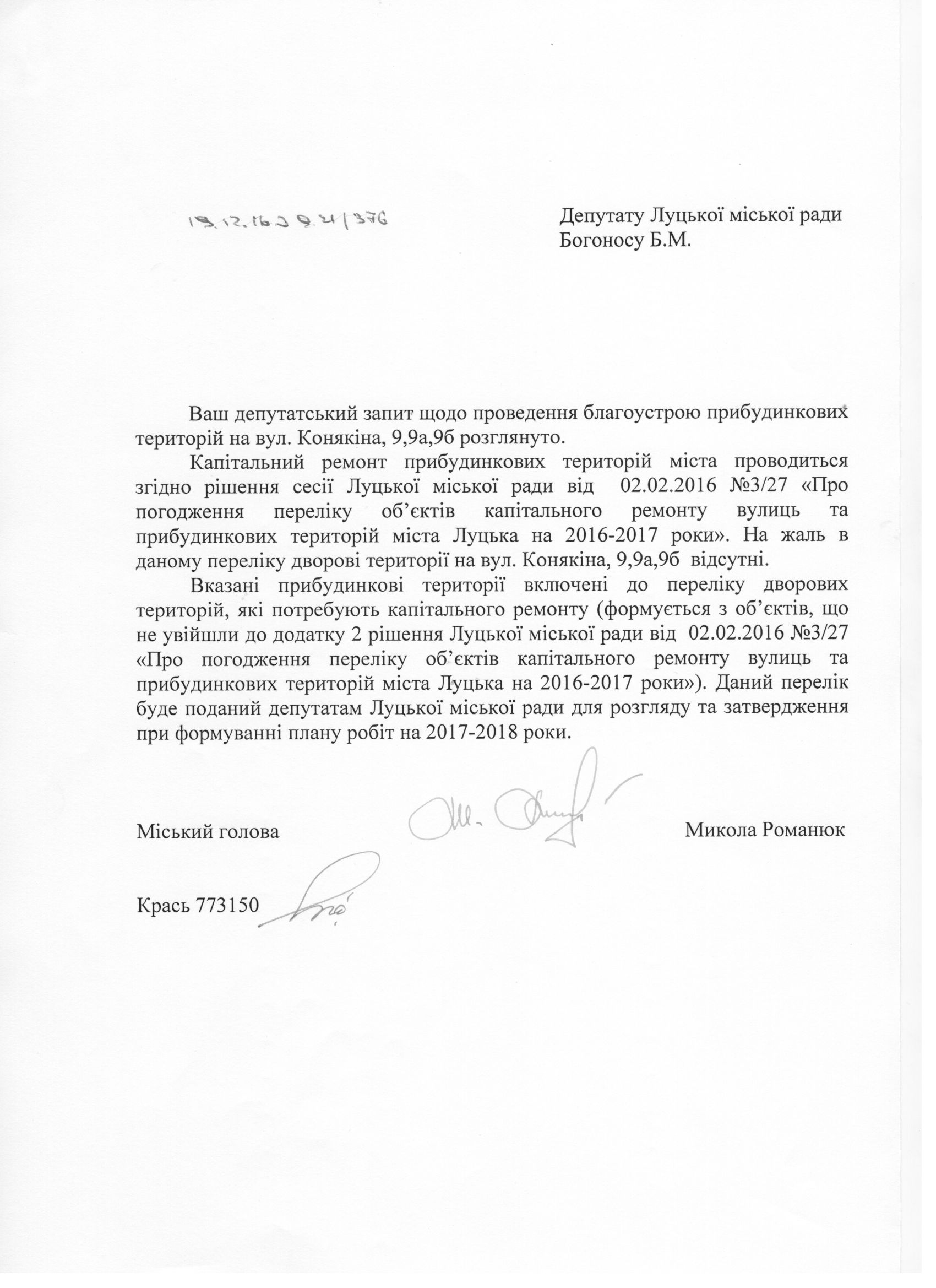 1. Підтримати запит депутата міської ради Богоноса Б.М. до міського голови Романюка М.Я. щодо ремонту прибудинкових територій на вул. Конякіна, 9, 9а, 9б (додається).